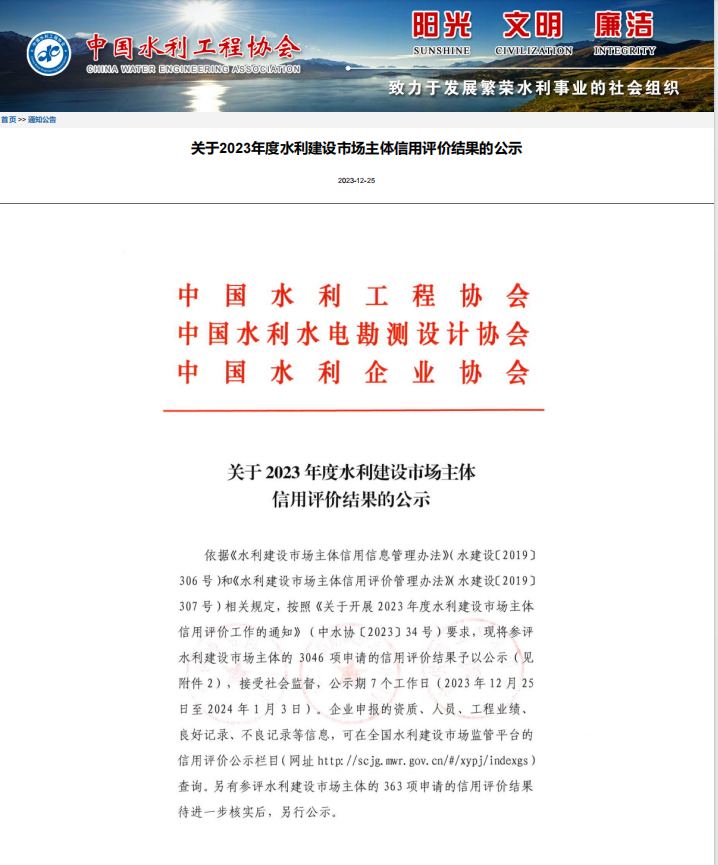 2023年12月25日,中國水利工程協(xié)會又傳來喜訊,經(jīng)過專業(yè)機(jī)構(gòu)評價、評審委員會審議,公司連續(xù)12年獲得“AAA企業(yè)信用等級”評價。......