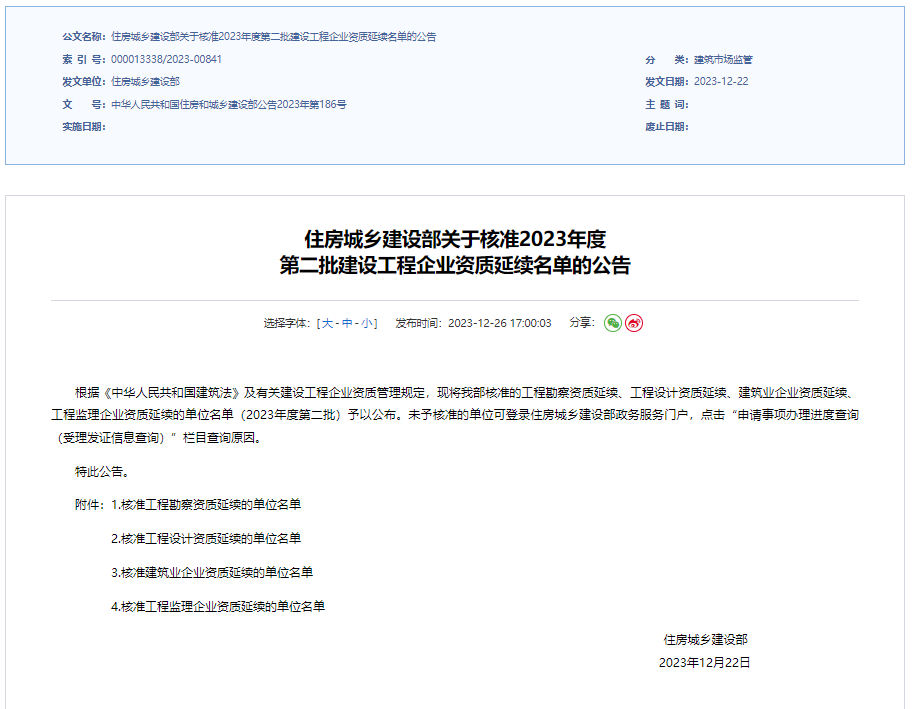 2023年12月26日,住房和城鄉(xiāng)建設(shè)部官網(wǎng)發(fā)布了2023年度第二批建設(shè)工程企業(yè)資質(zhì)延續(xù)核準(zhǔn)名單,我司提交的建筑工程、水利水電工程、市政公用工程三個(gè)專業(yè)施工總承包壹級(jí)資質(zhì)延續(xù)申請(qǐng)全部獲得審批通過。