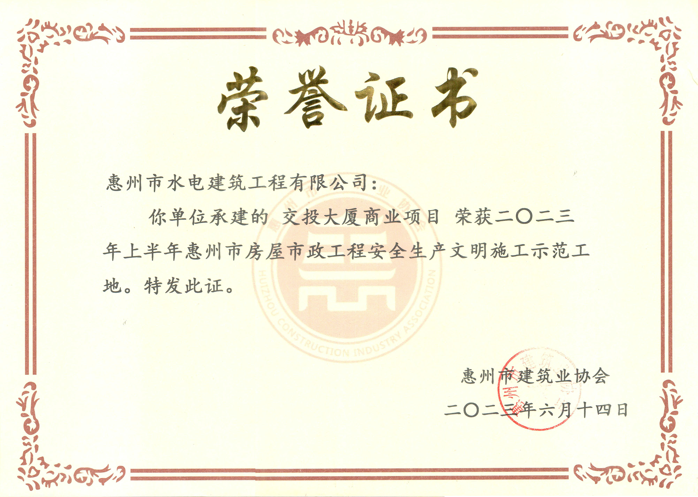 近日,惠州市建筑業(yè)協(xié)會傳來喜訊,我司承建的惠州新材料產(chǎn)業(yè)園污水處理廠一期建設項目、交投大廈商業(yè)項目同時榮獲“市房屋市政工程安全生產(chǎn)文明施工示范工地”。