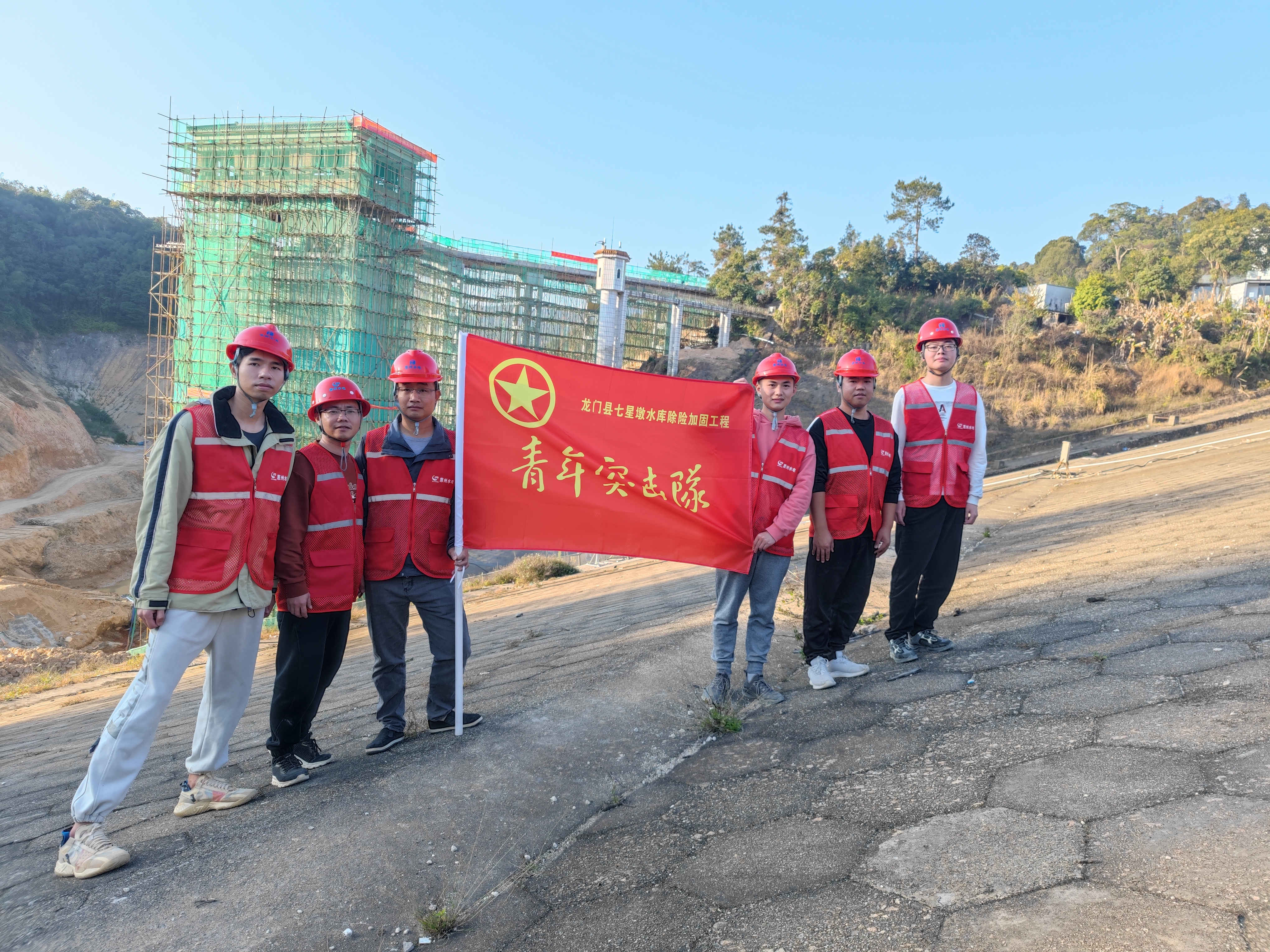 其中龍門縣七星墩水庫除險加固工程青年突擊隊在項目中發(fā)揮了重大作用,為了順利完成節(jié)點目標(biāo)任務(wù),更好的服務(wù)民生,2023年12 月中旬嚴(yán)冬寒風(fēng)凜冽、氣溫已逼近零度時,施工現(xiàn)場仍呈現(xiàn)一片熱火朝天的施工場面,現(xiàn)場技術(shù)人員和工人們已奮戰(zhàn)百日,堅持降溫不降速,全力確保主體順利封頂?,F(xiàn)場技術(shù)人員均為青年突擊隊隊員,他們在這場爭分奪秒的“戰(zhàn)斗”中無懼環(huán)境的變化,眾人齊心協(xié)力,擰成一股麻繩,展現(xiàn)出勇于擔(dān)當(dāng)、敢于作為、敢于拼搏青年的力量。
