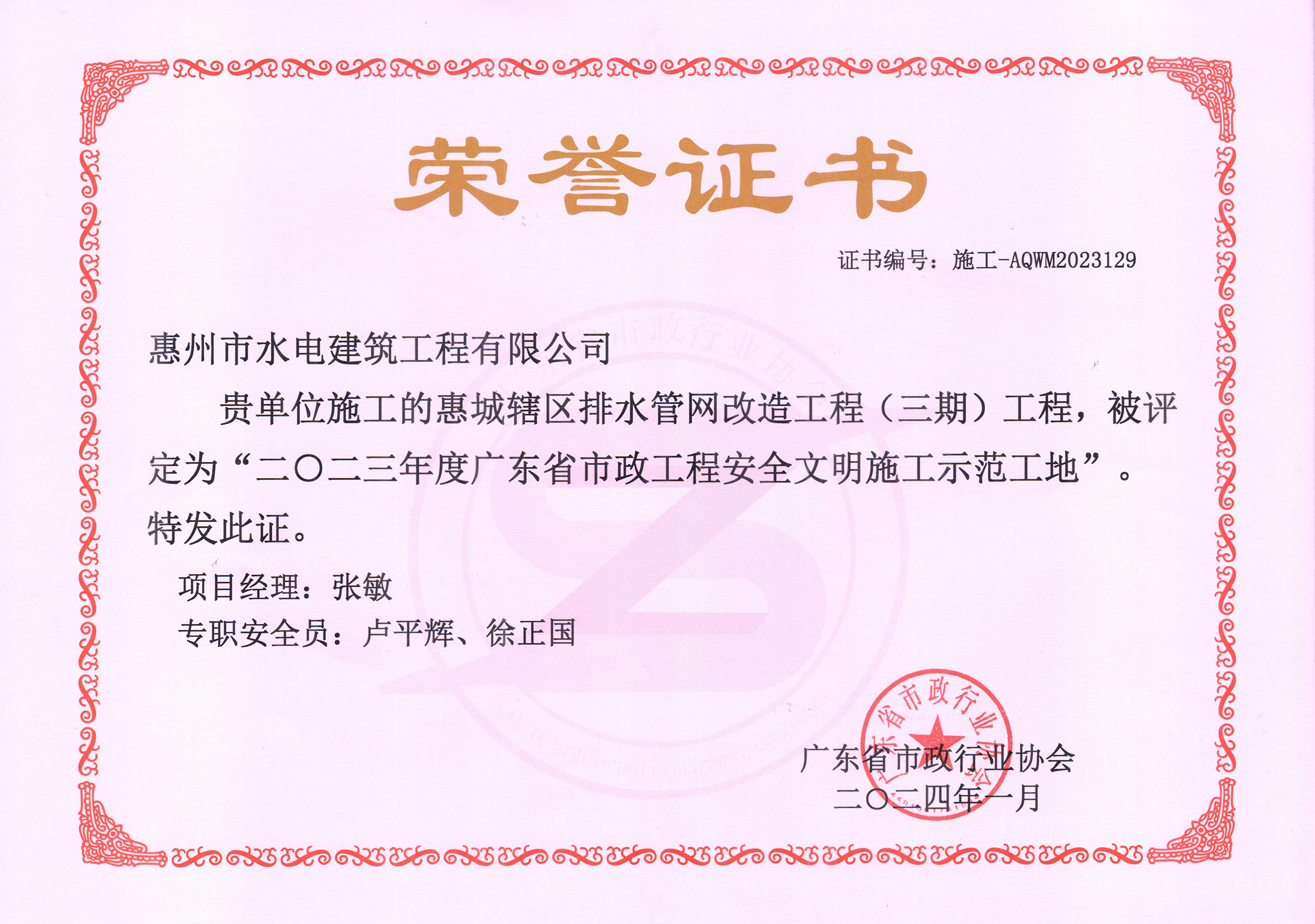 近日,我司收到廣東省市政行業(yè)協(xié)會發(fā)來的榮譽證書,承建的惠城轄區(qū)排水管網(wǎng)改造工程(三期)工程榮獲“2023年度廣東省市政工程安全文明施工示范工地”。這是繼惠州市白花河防洪排澇治理工程項目之后,公司在2023年度獲得的又一項省級安全文明工地獎項,為公司年度創(chuàng)優(yōu)工作劃上圓滿的句號。