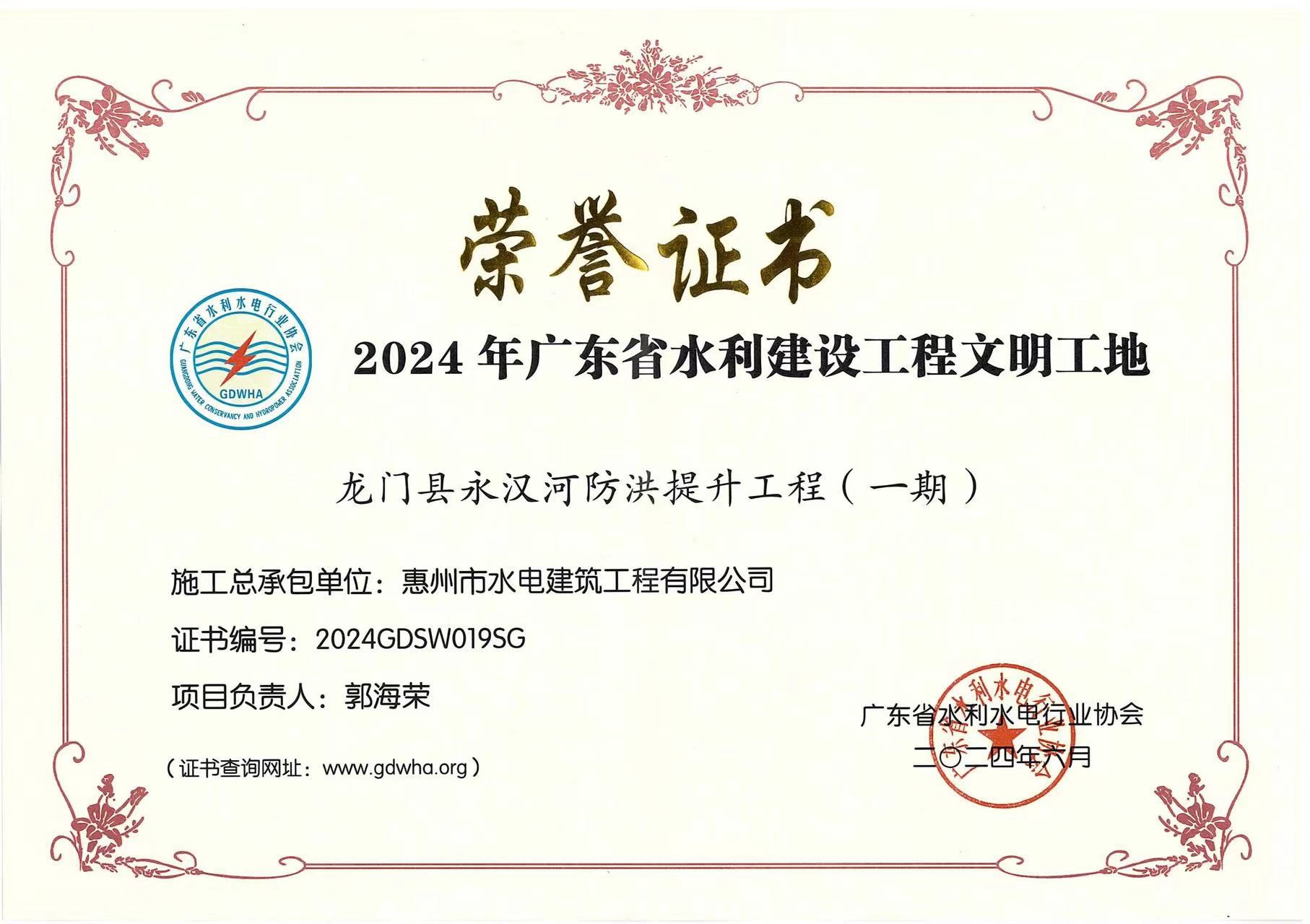 近年來,我司在水利建設(shè)工程創(chuàng)建文明工地方面取得豐碩成果,6月,公司收到廣東省水利水電行業(yè)協(xié)會頒發(fā)的榮譽證書,由我司承建的龍門縣永漢河防洪提升工程(一期)榮獲2024年廣東省水利建設(shè)工程文明工地。