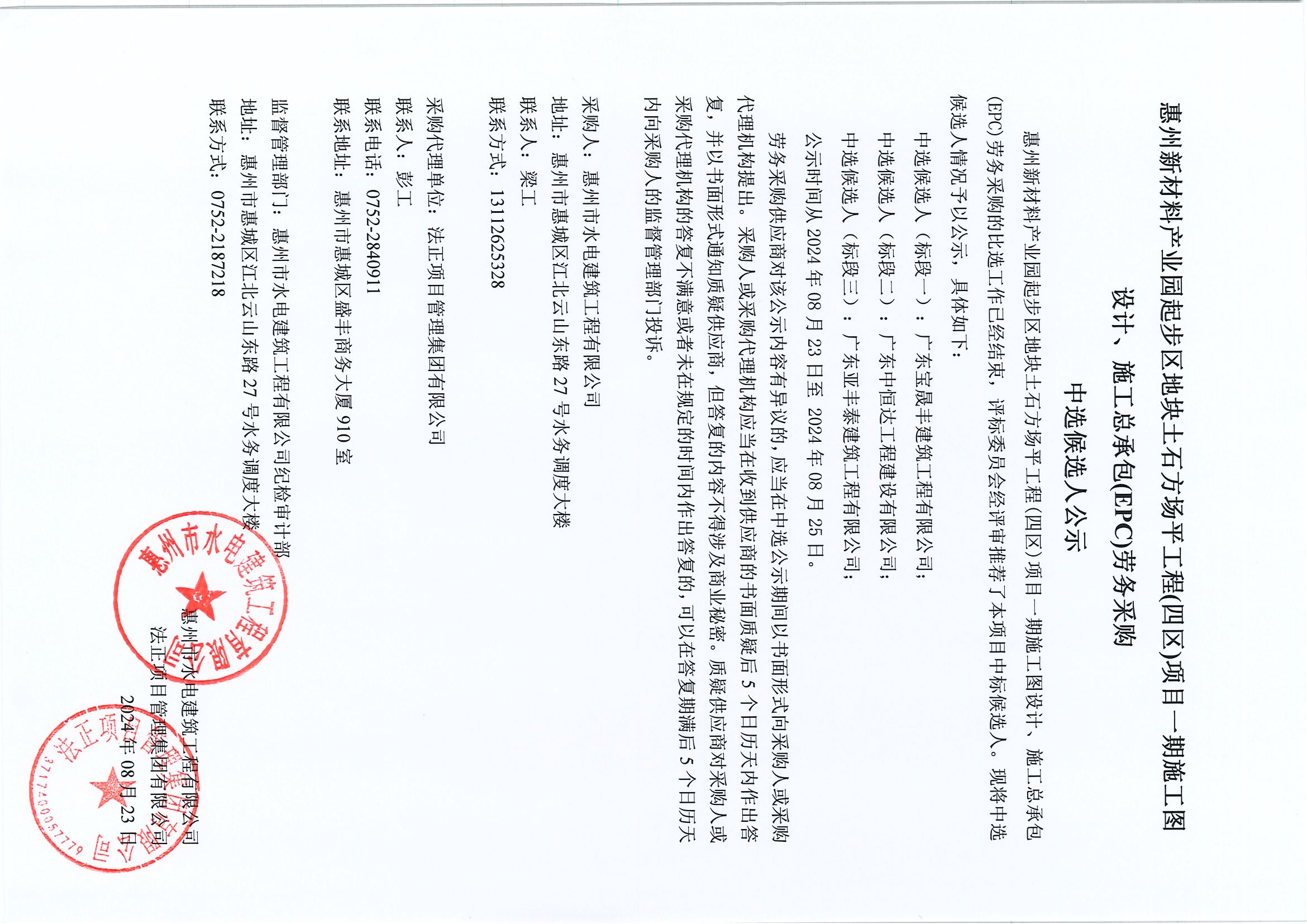 惠州新材料產(chǎn)業(yè)園起步區(qū)地塊土石方場平工程(四區(qū))項目一期施工圖設(shè)計、施工總承包(EPC)勞務(wù)采購中選候選人公示