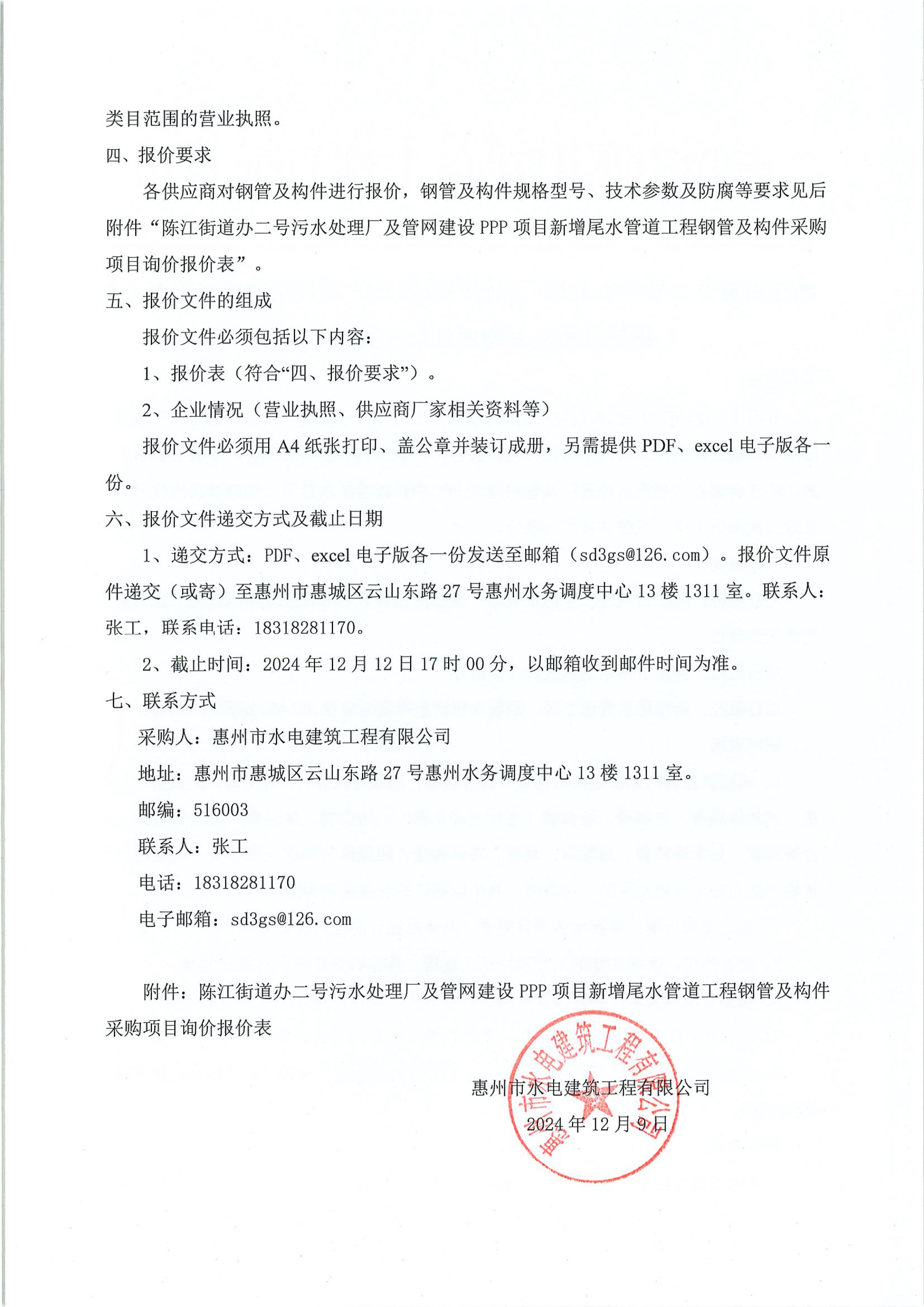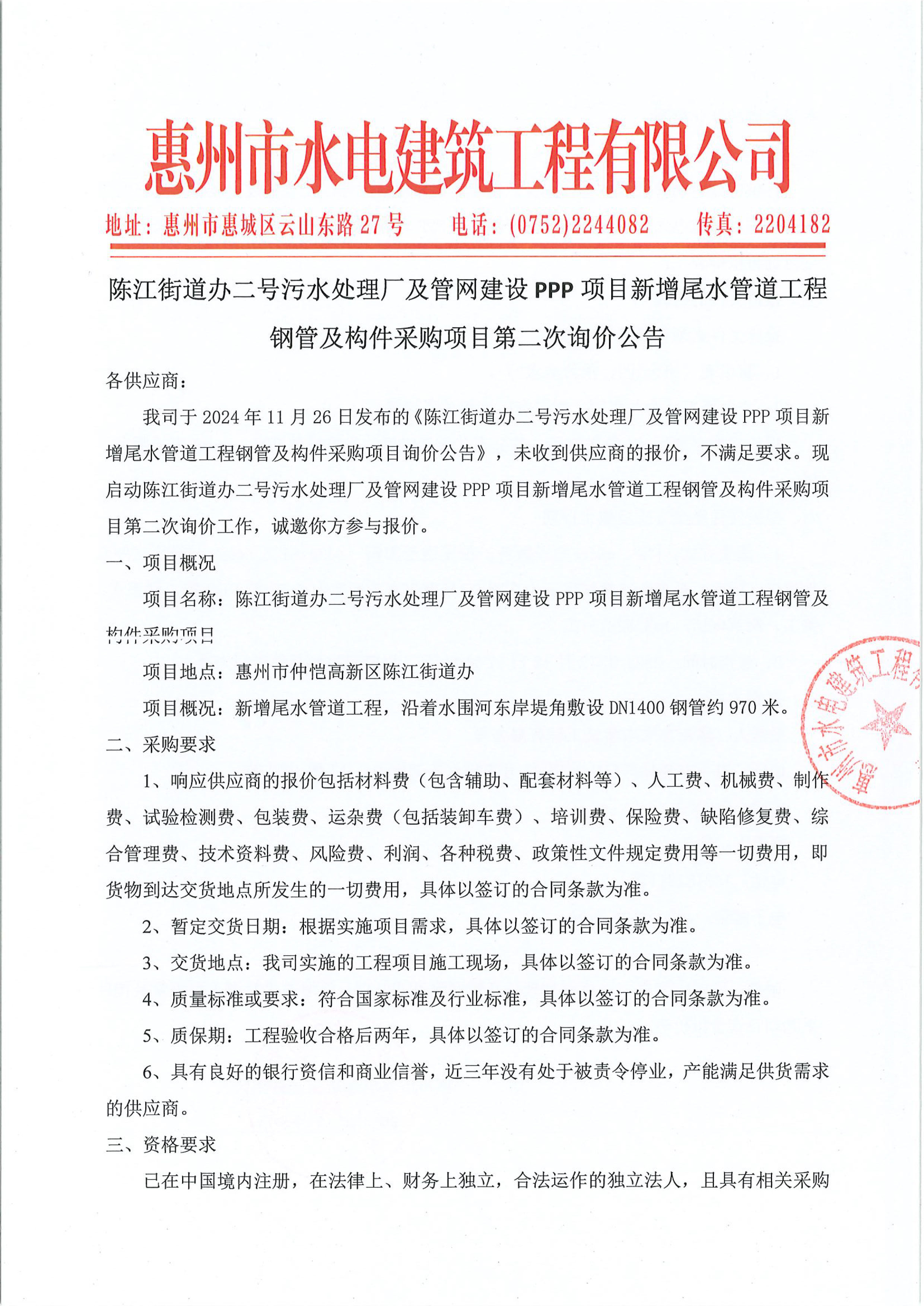 陳江街道辦二號污水處理廠及管網(wǎng)建設(shè)PPP項目新增尾水管道工程鋼管及構(gòu)件采購項目第二次詢價公告附件: