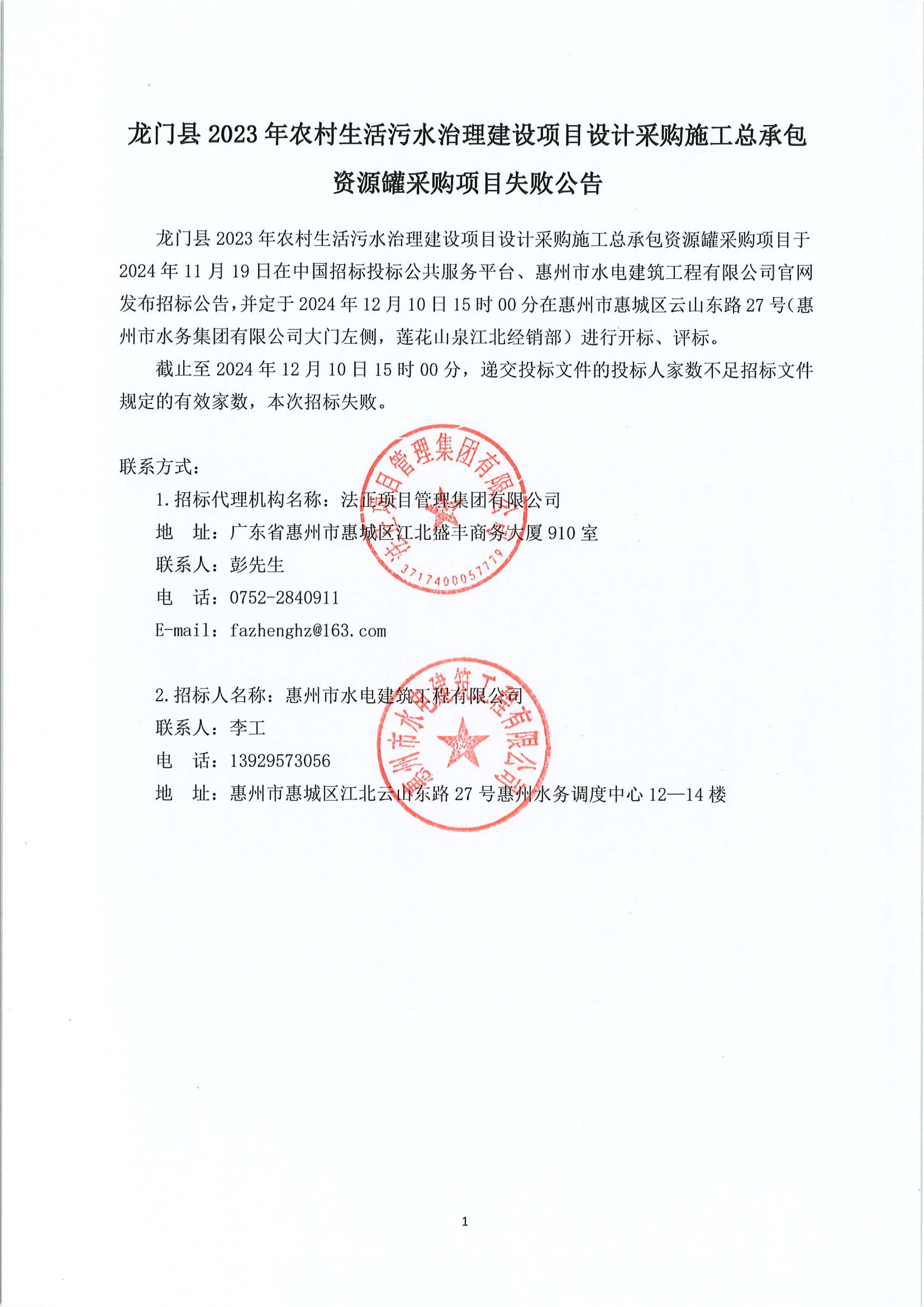 龍門縣2023年農(nóng)村生活污水治理建設(shè)項(xiàng)目設(shè)計(jì)采購(gòu)施工總承包資源罐采購(gòu)項(xiàng)目失敗公告