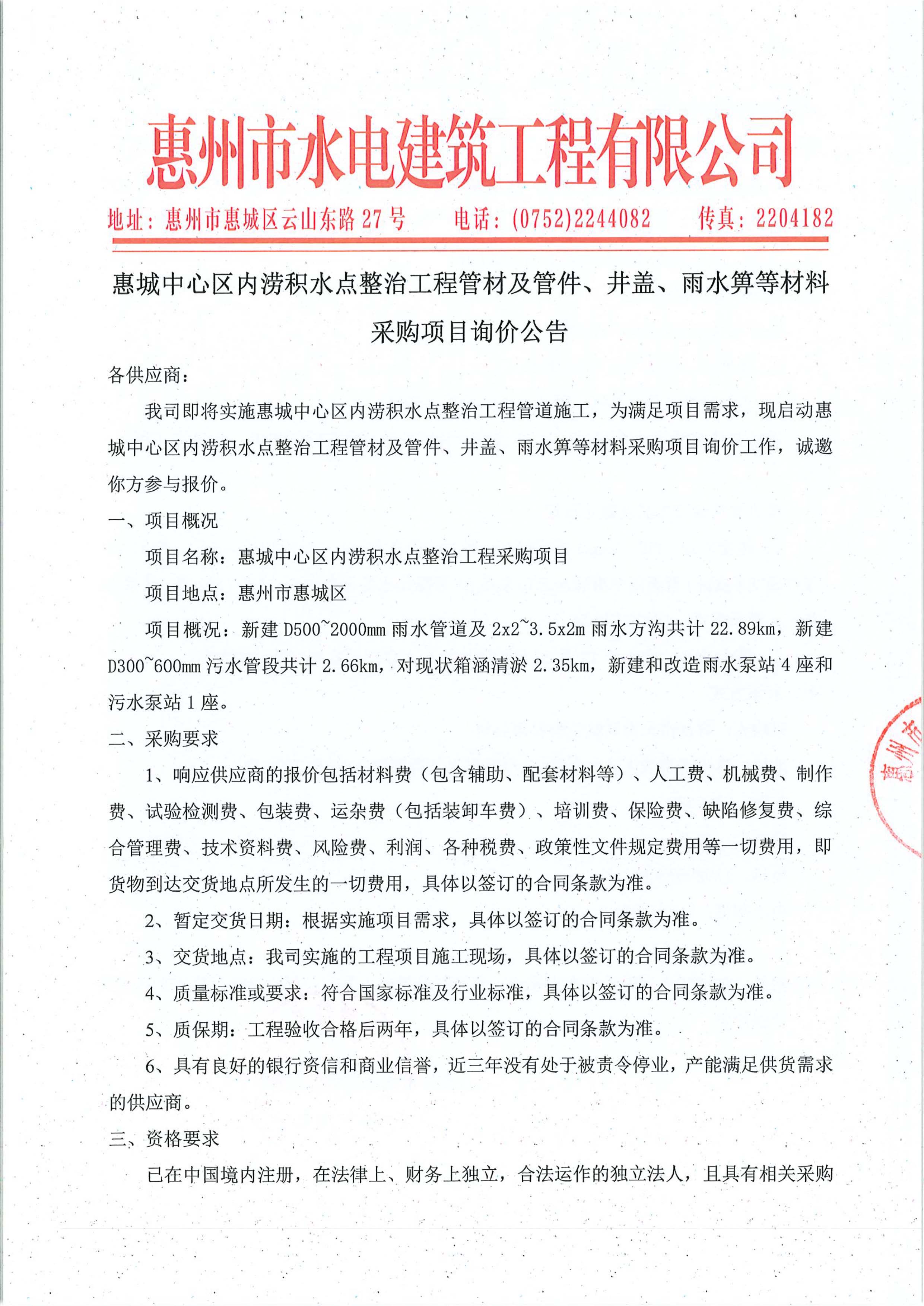 惠城中心區(qū)內澇積水點整治工程管材及管件、井蓋、雨水箅等材料采購項目詢價公告