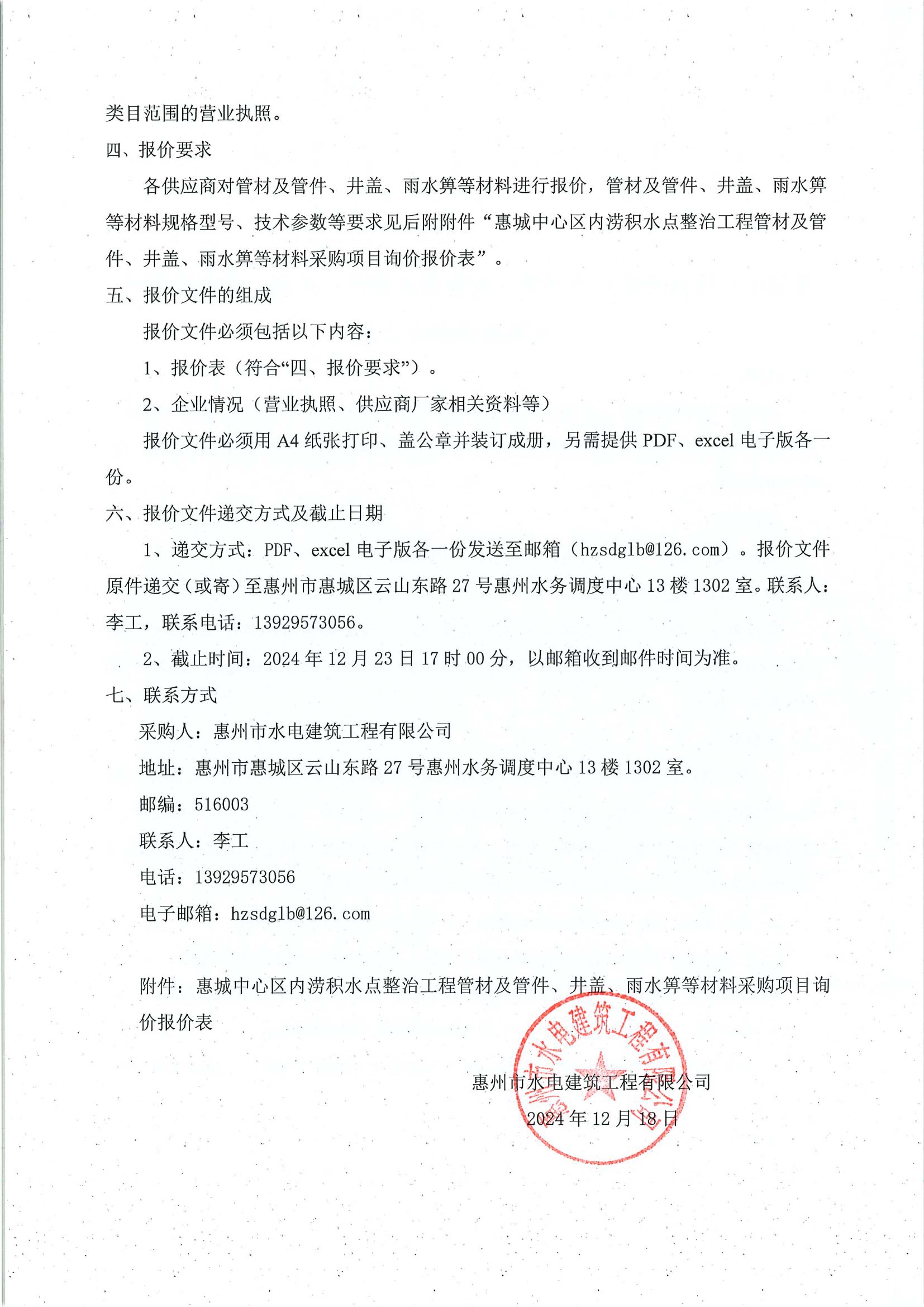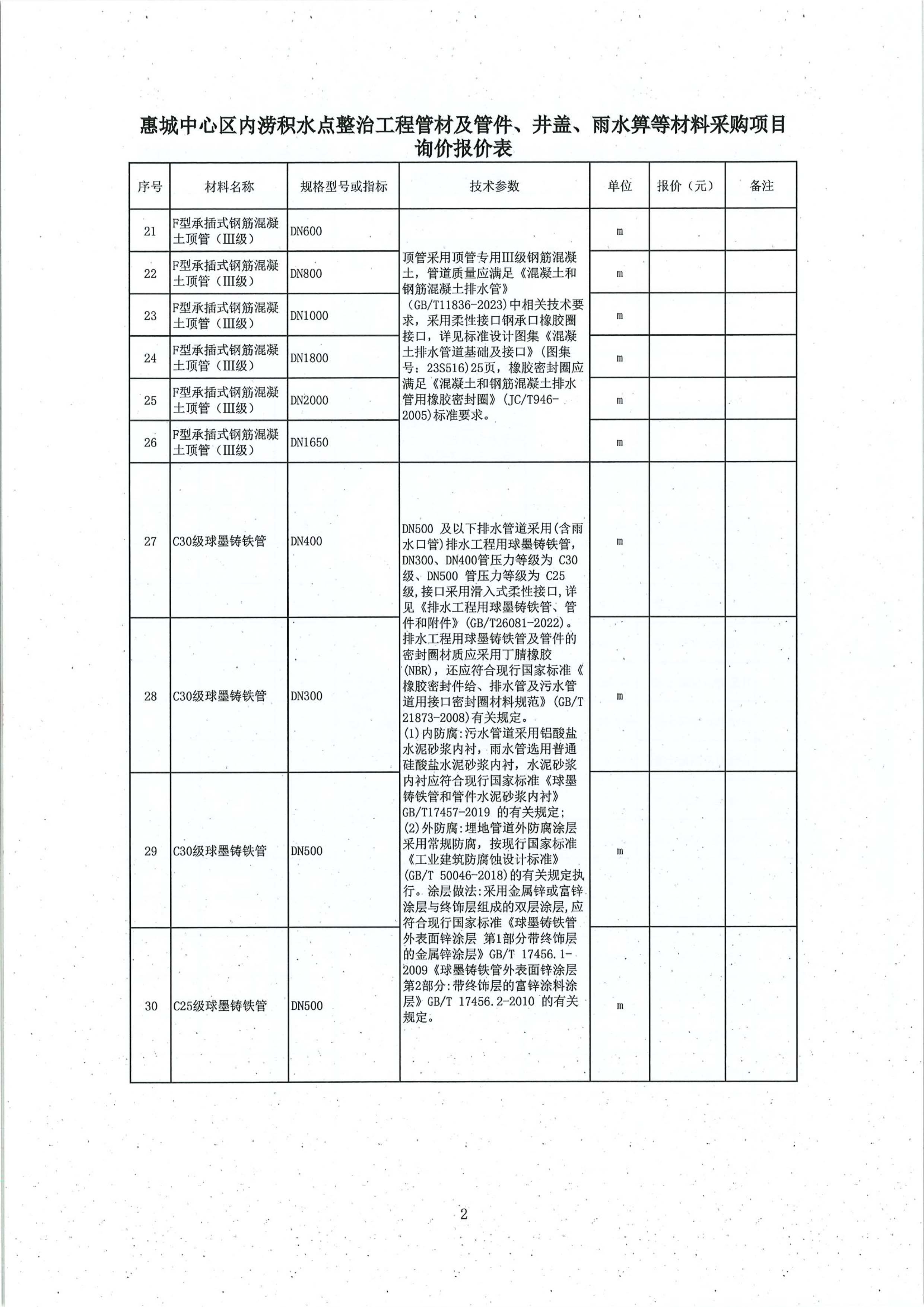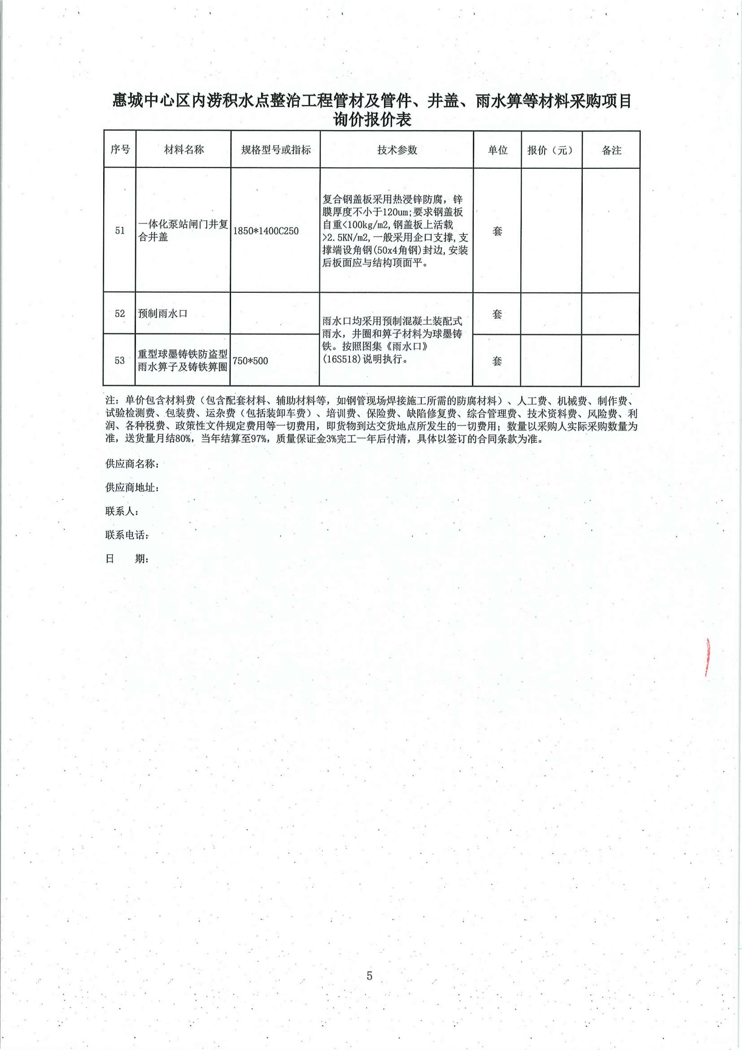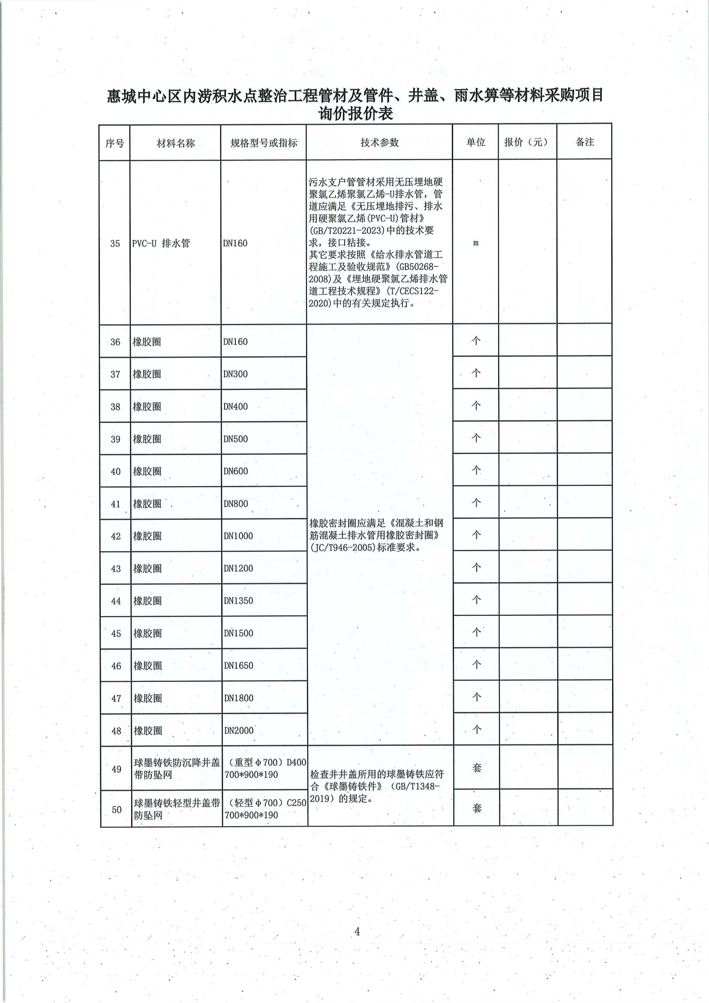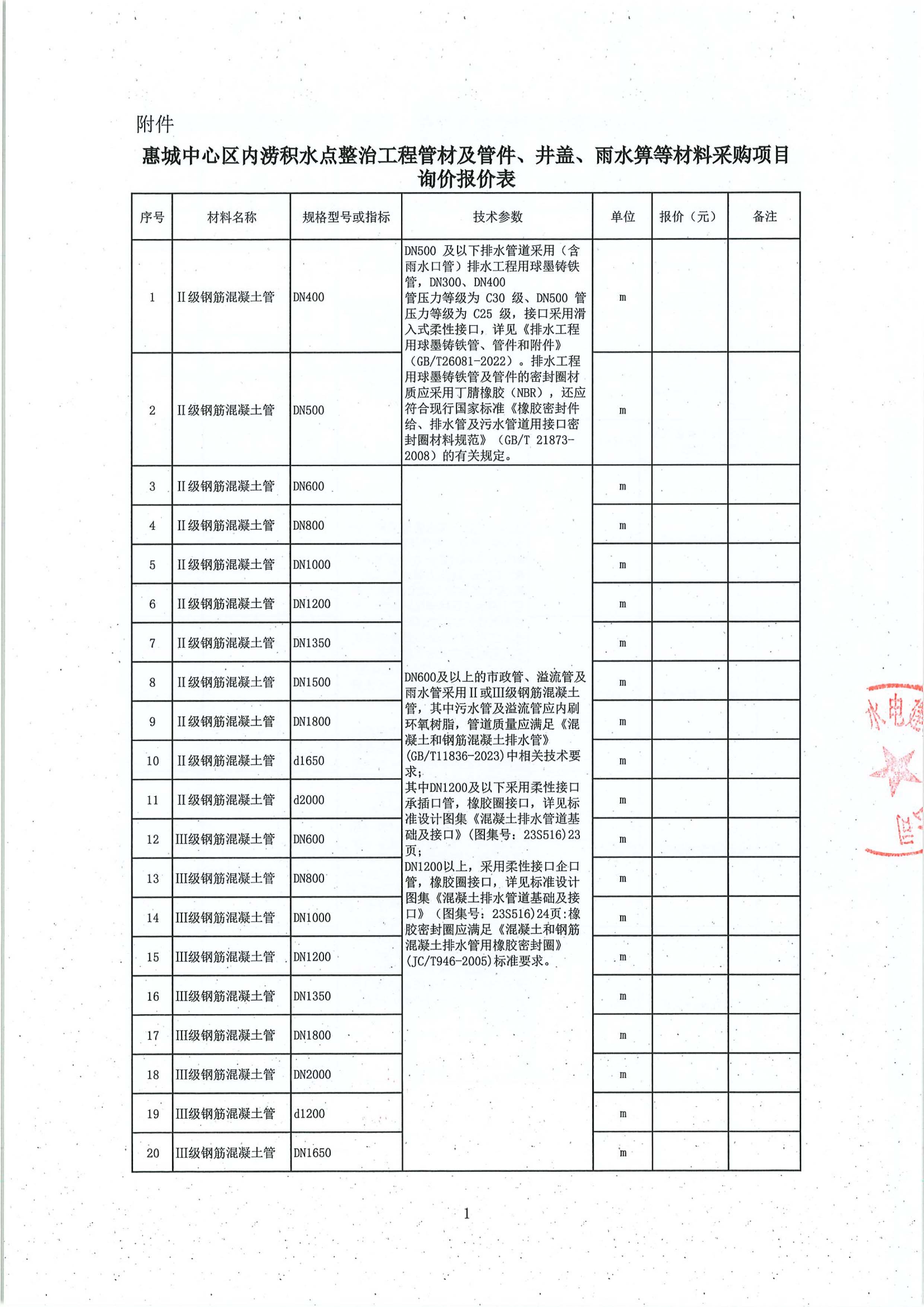 附件:惠城中心區(qū)內澇積水點整治工程管材及管件、井蓋、雨水箅等材料采購項目詢價報價表
