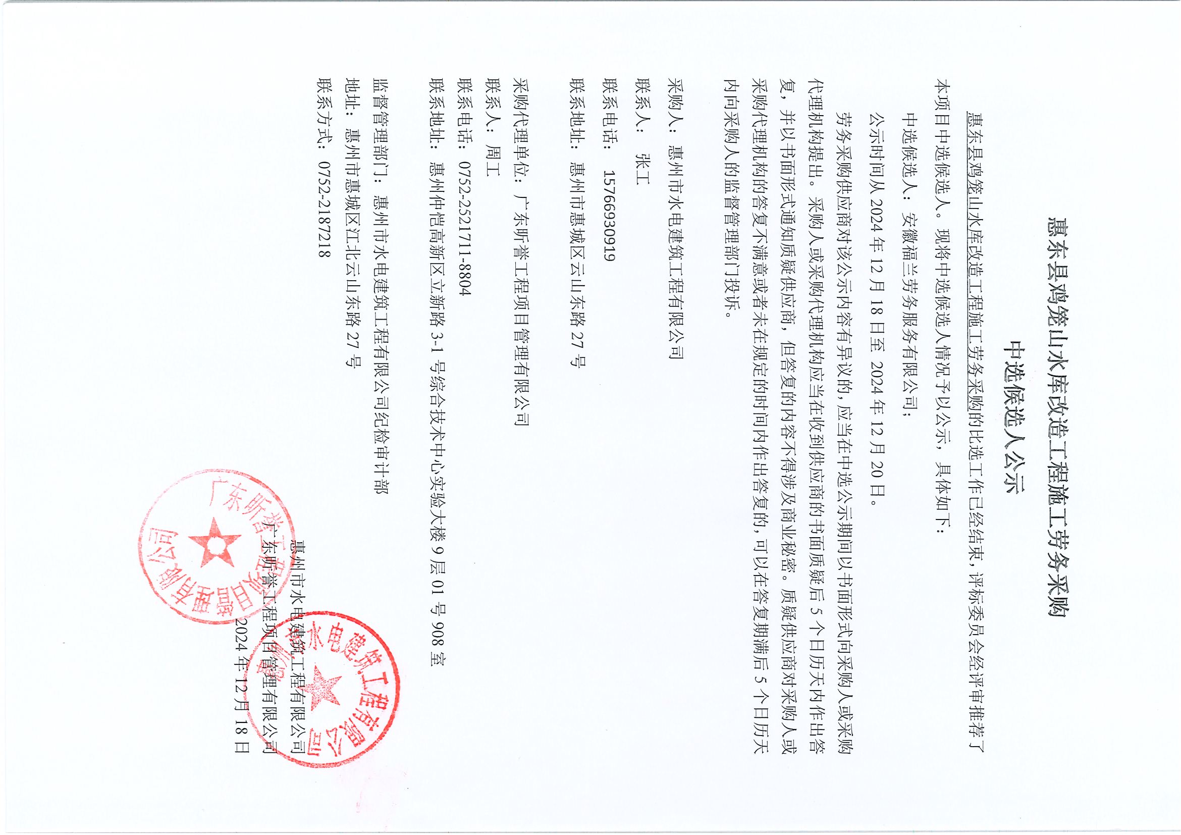 惠東縣雞籠山水庫改造工程施工勞務(wù)采購中選候選人公示