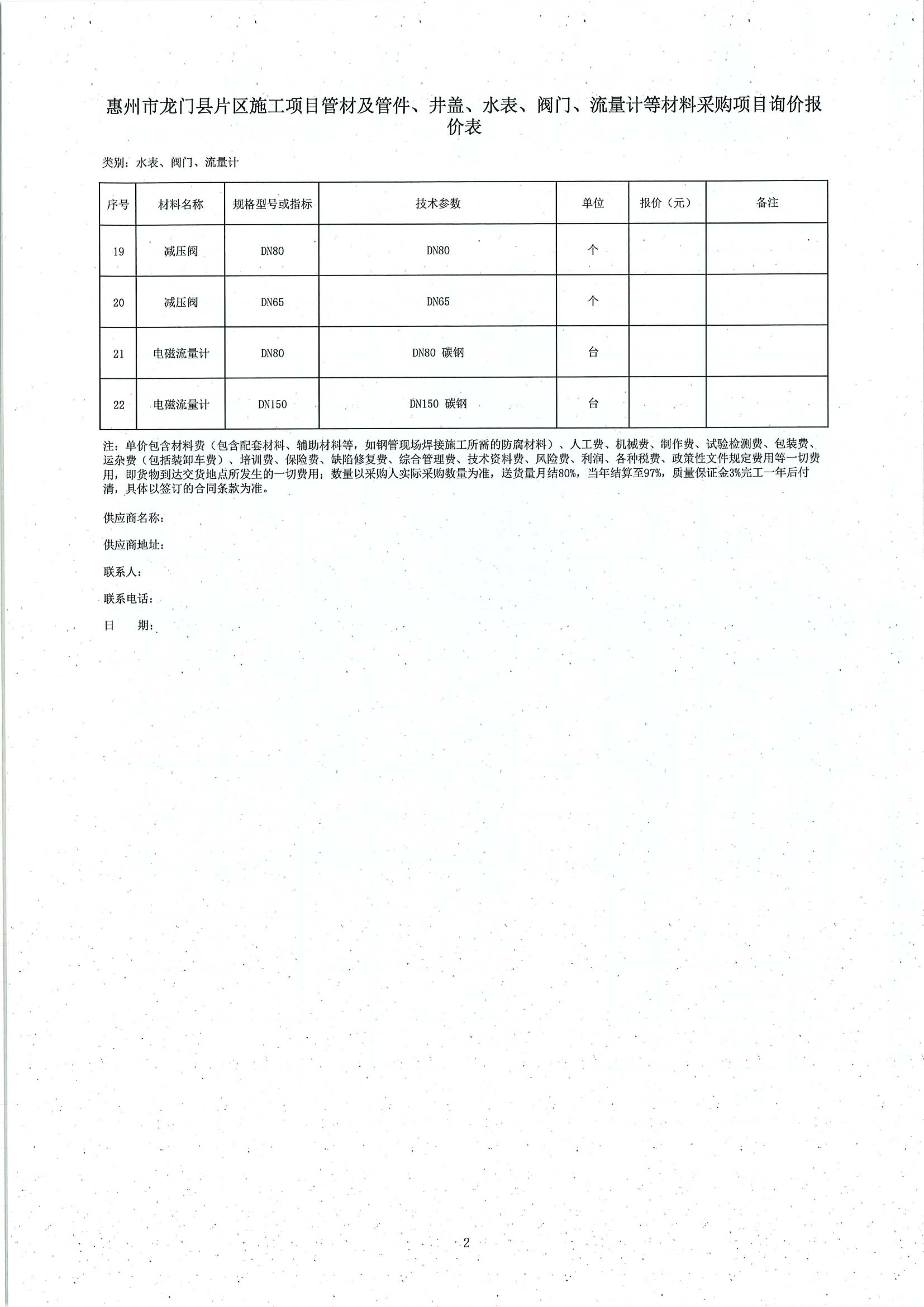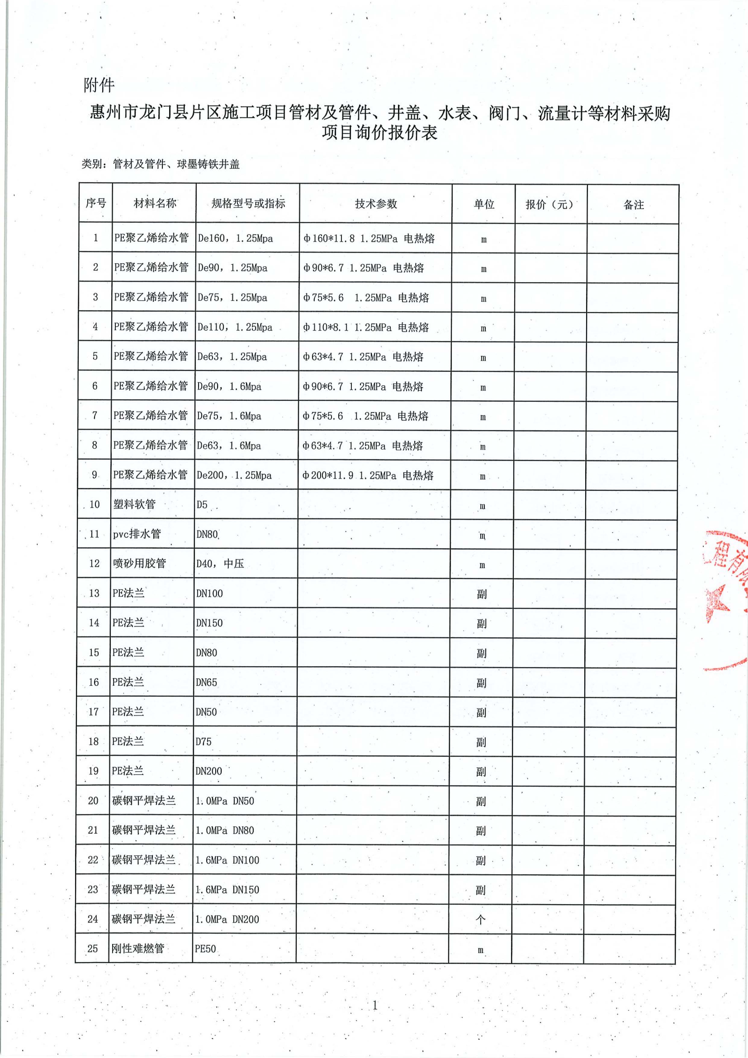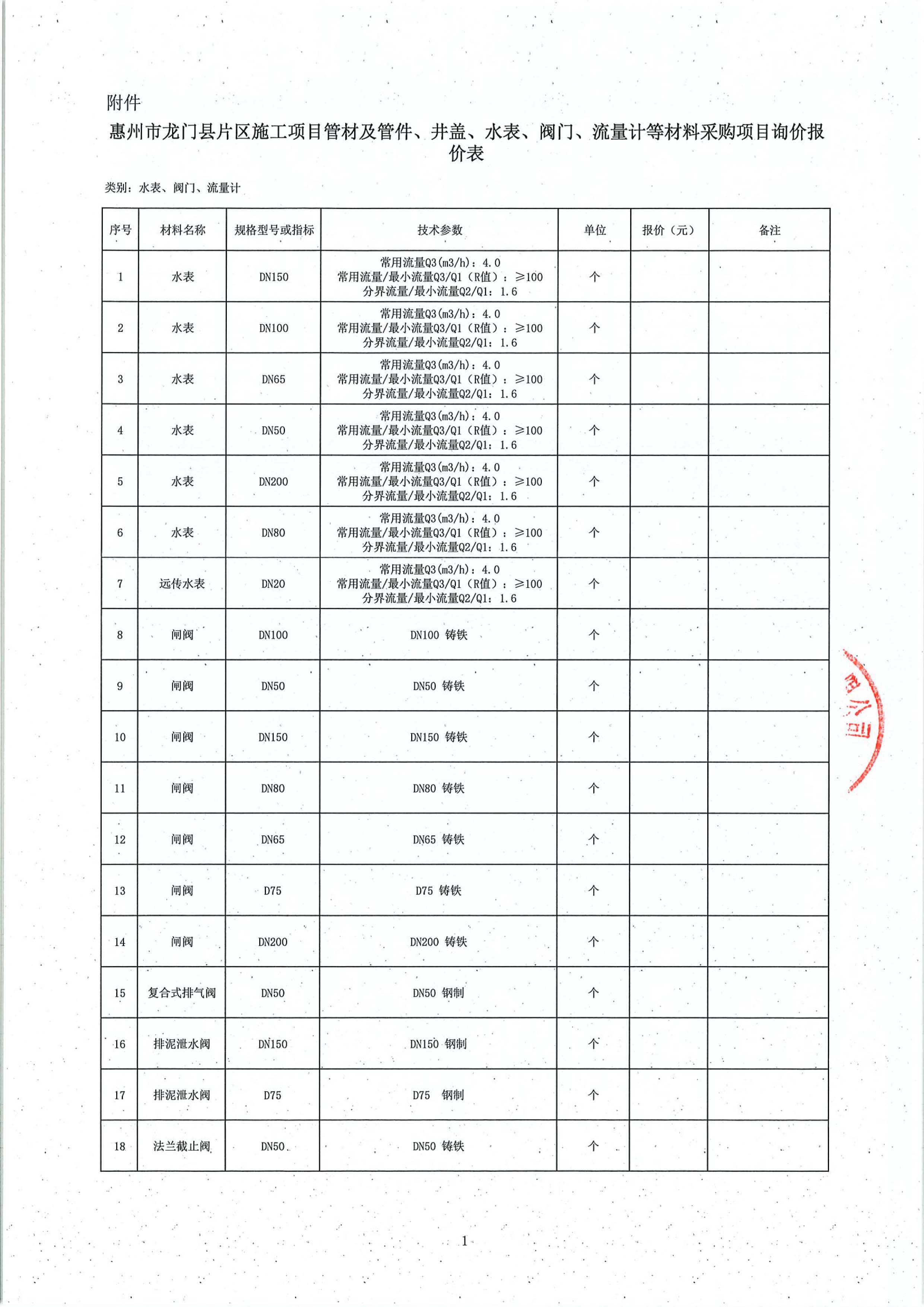 惠州市龍門縣片區(qū)施工項(xiàng)目管材及管件、井蓋、水表、閥門、流量計(jì)等材料采購項(xiàng)目詢價(jià)公告附件: