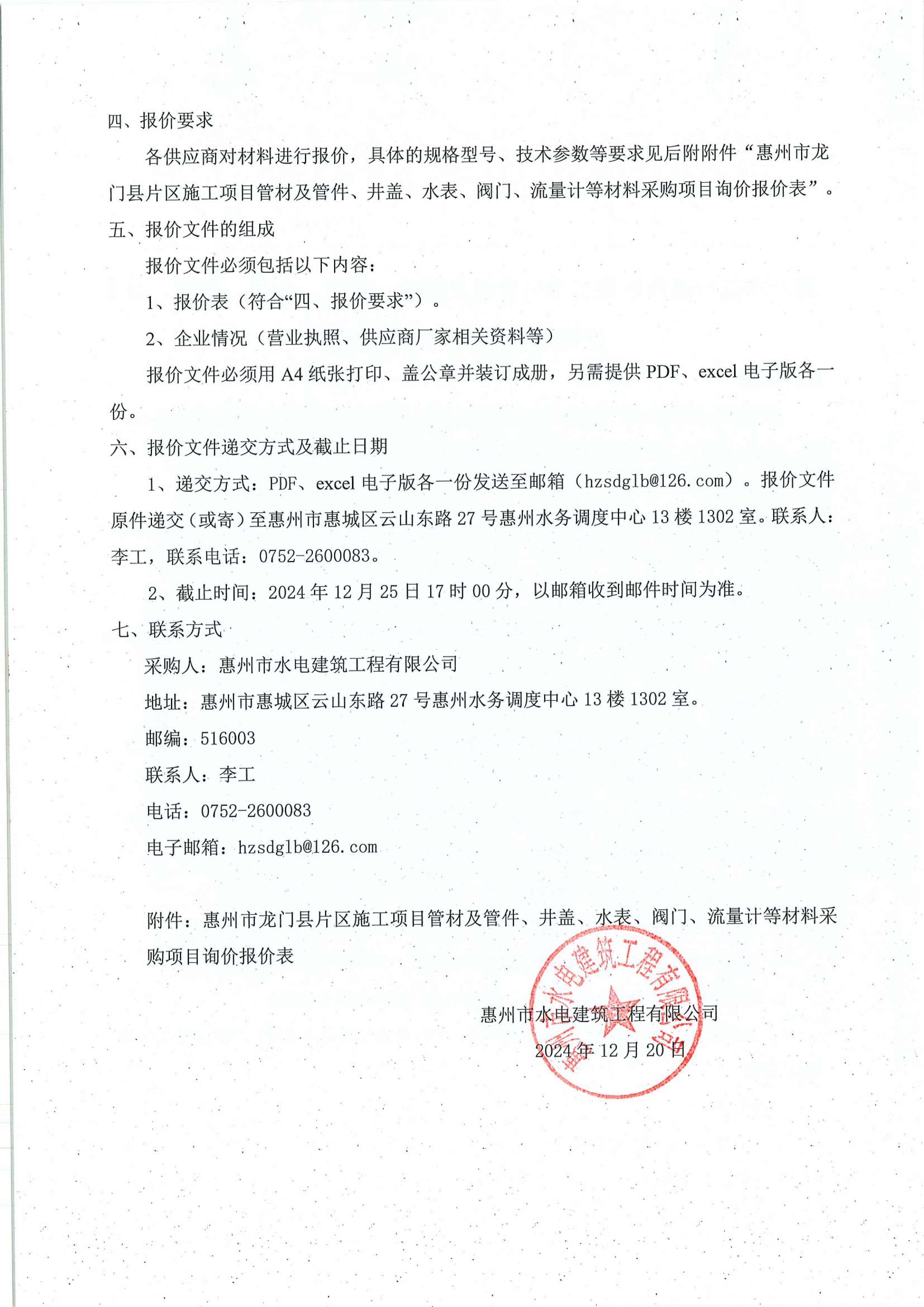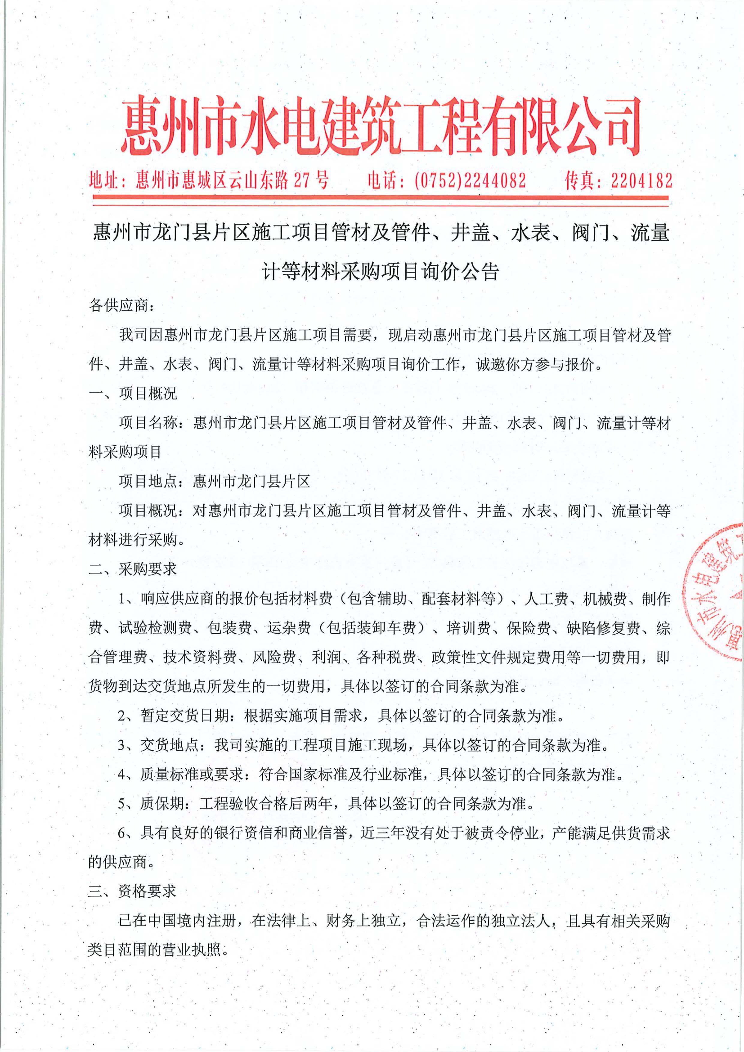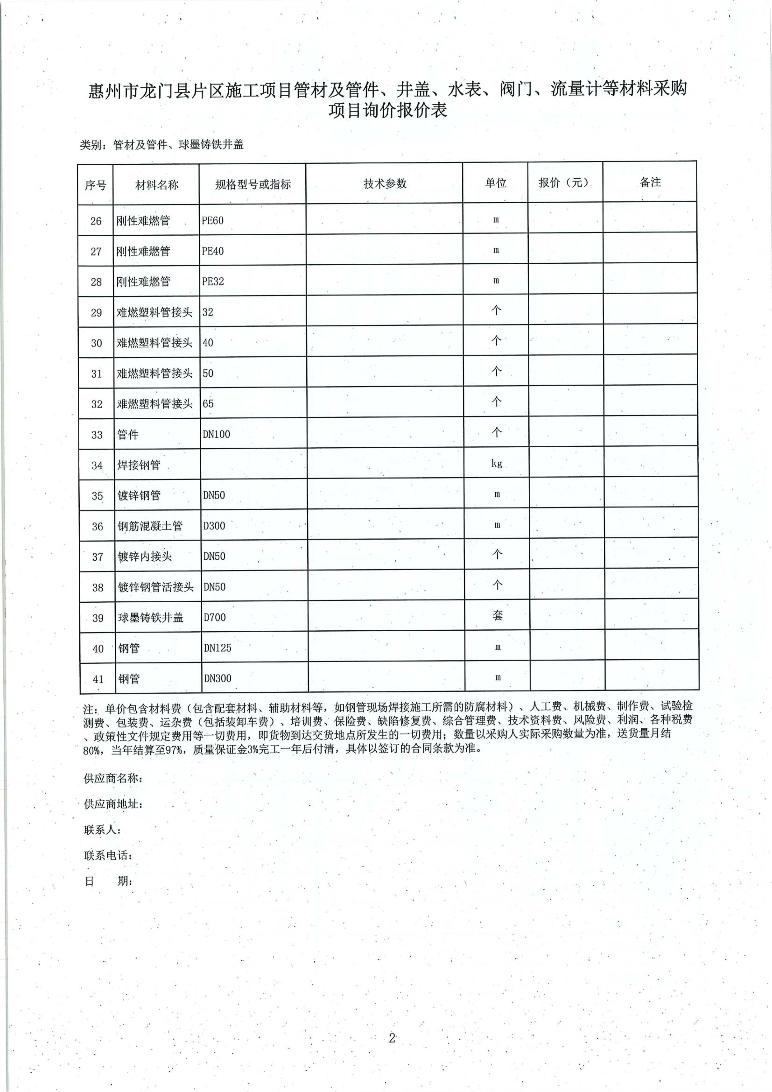 惠州市龍門縣片區(qū)施工項(xiàng)目管材及管件、井蓋、水表、閥門、流量計(jì)等材料采購項(xiàng)目詢價(jià)公告附件: