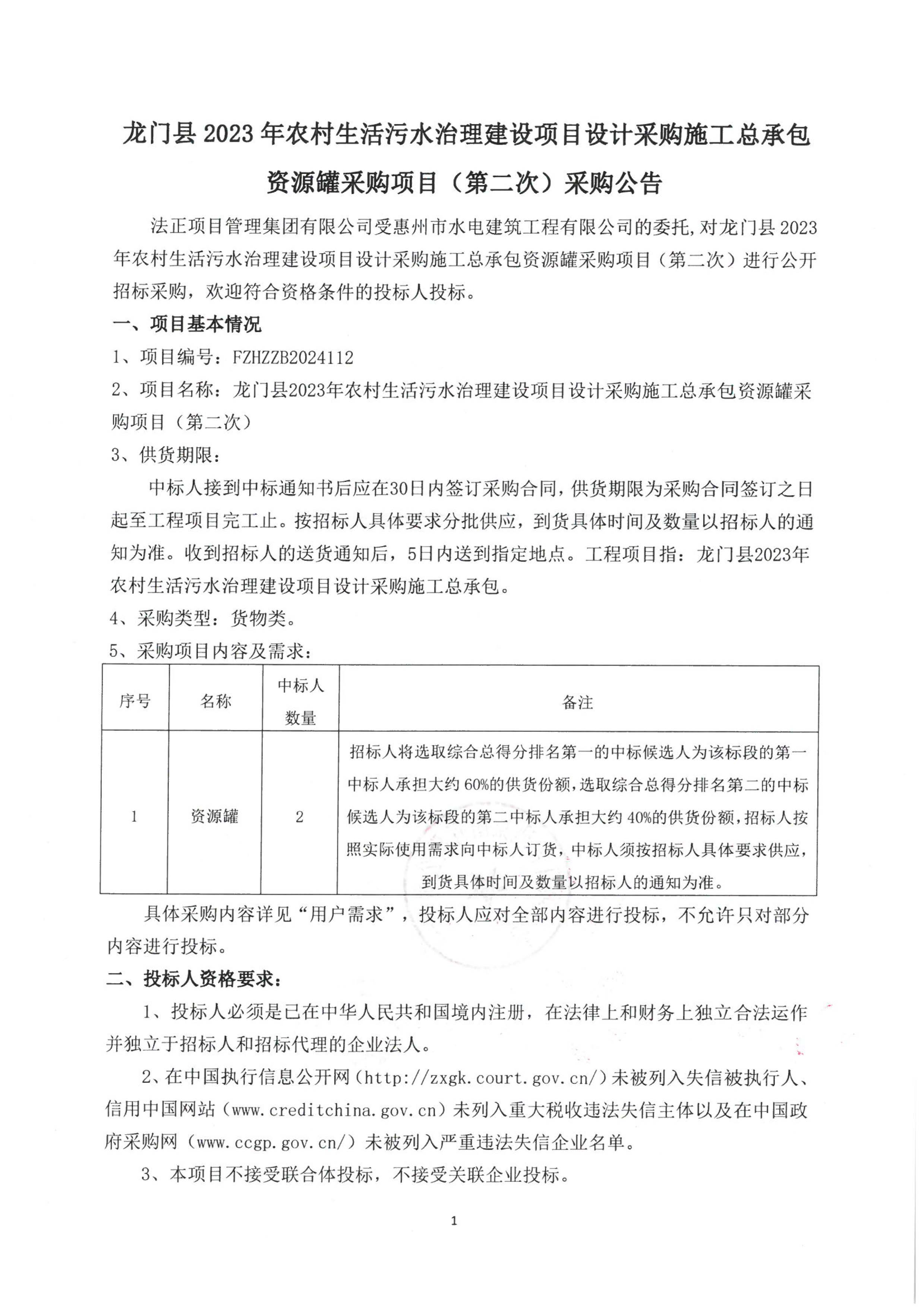 龍門縣2023年農(nóng)村生活污水治理建設(shè)項(xiàng)目設(shè)計(jì)采購施工總承包資源罐采購項(xiàng)目(第二次)采購公告