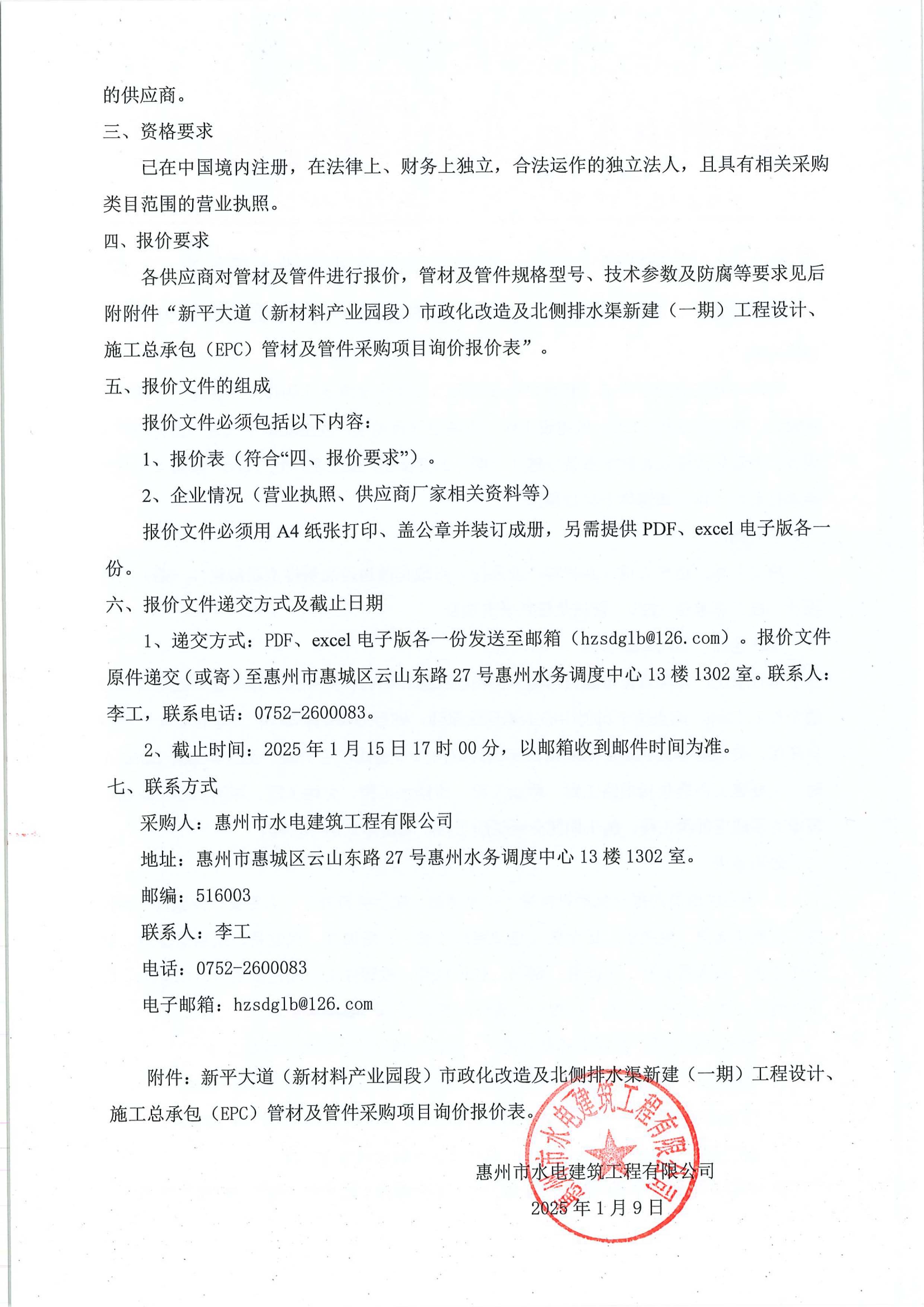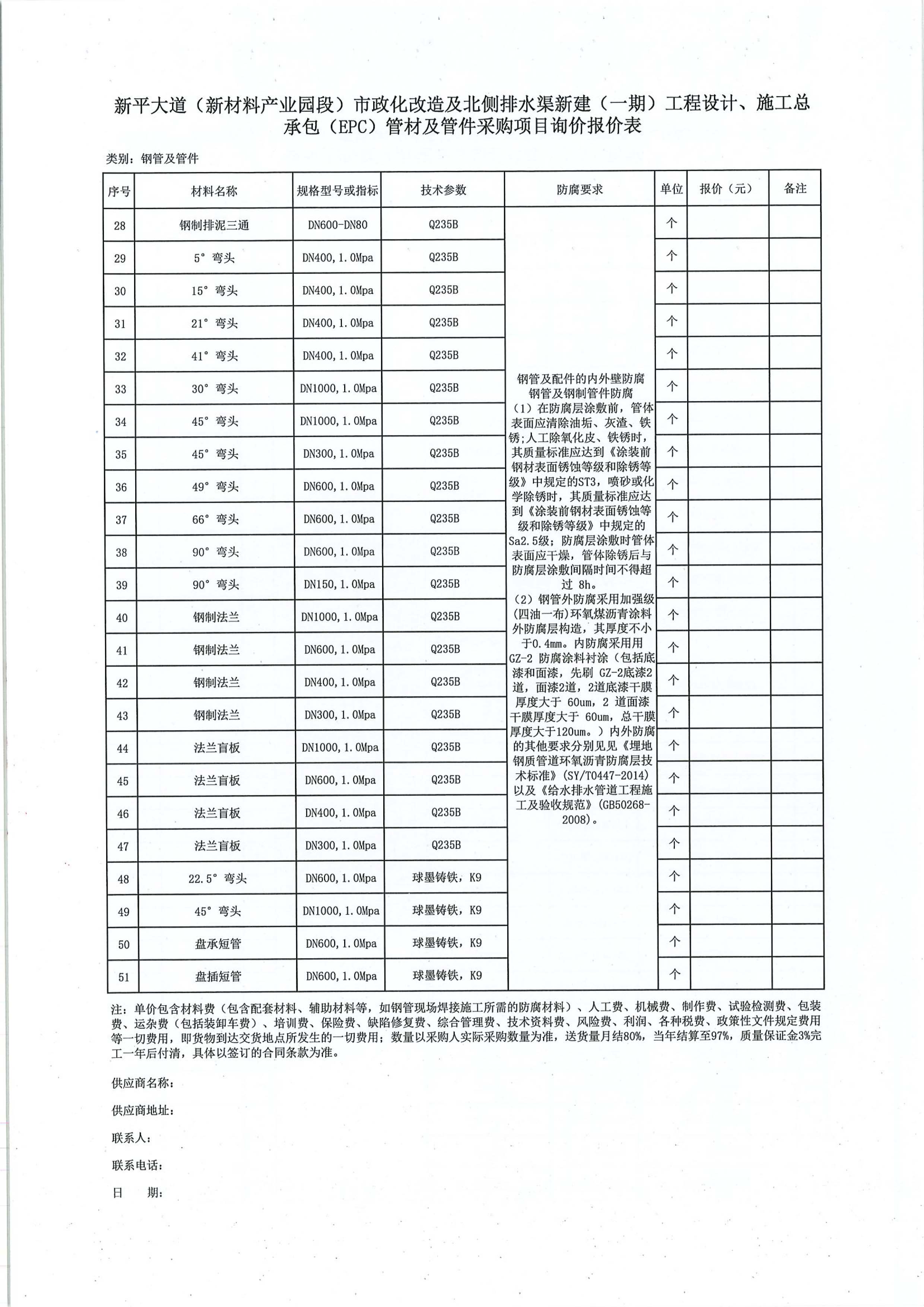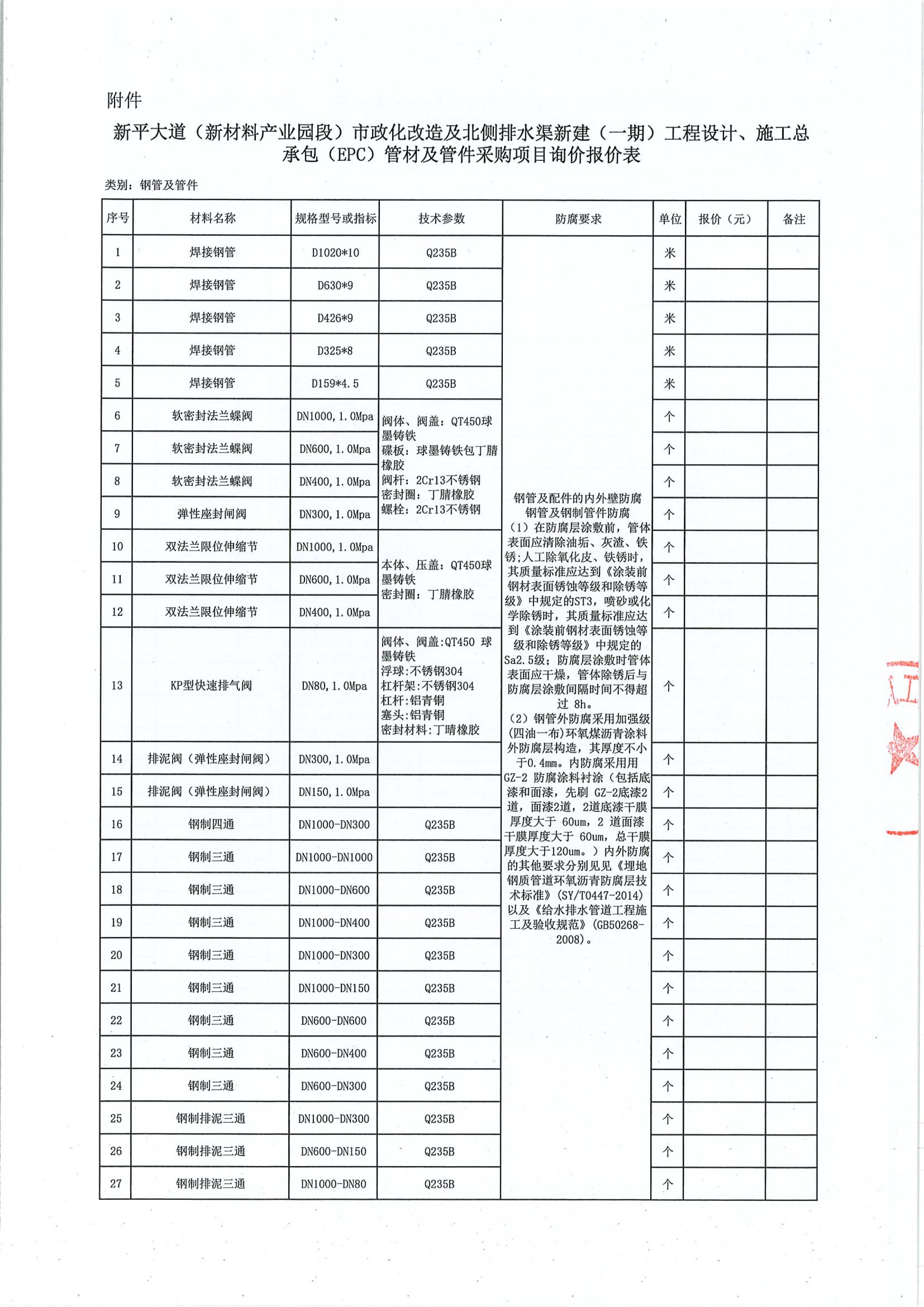 新平大道(新材料產(chǎn)業(yè)園段)市政化改造及北側(cè)排水渠新建(一期)工程設(shè)計、施工總承包(EPC)管材及管件采購項目詢價公告附件: