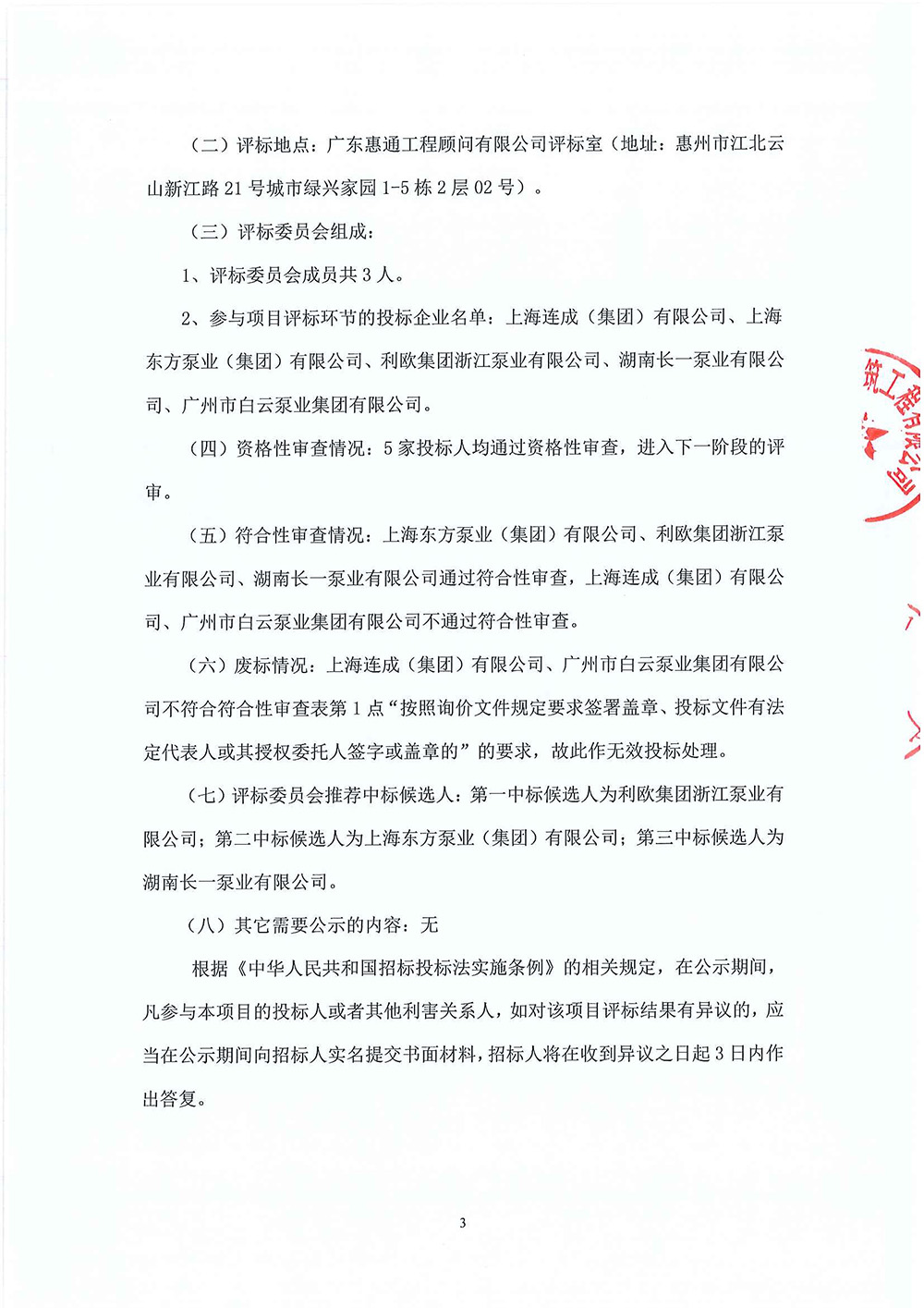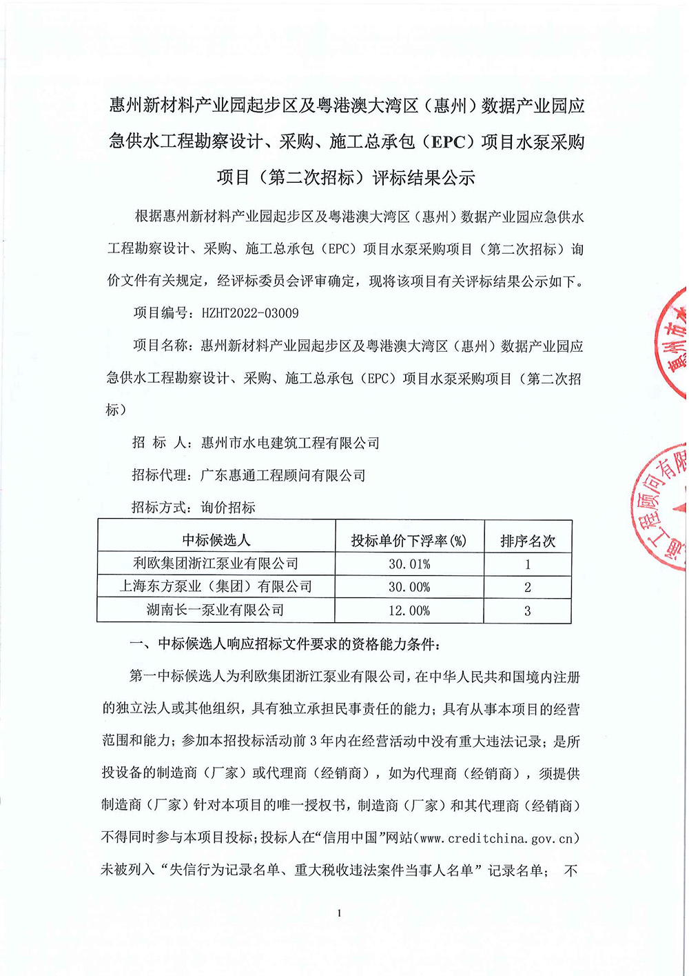 惠州新材料產(chǎn)業(yè)園起步區(qū)及粵港澳大灣區(qū)(惠州)數(shù)據(jù)產(chǎn)業(yè)園應(yīng)急供水工程勘察設(shè)計(jì)、采購、施工總承包(EPC)項(xiàng)目水泵采購項(xiàng)目(第二次招標(biāo))評(píng)標(biāo)結(jié)果公示