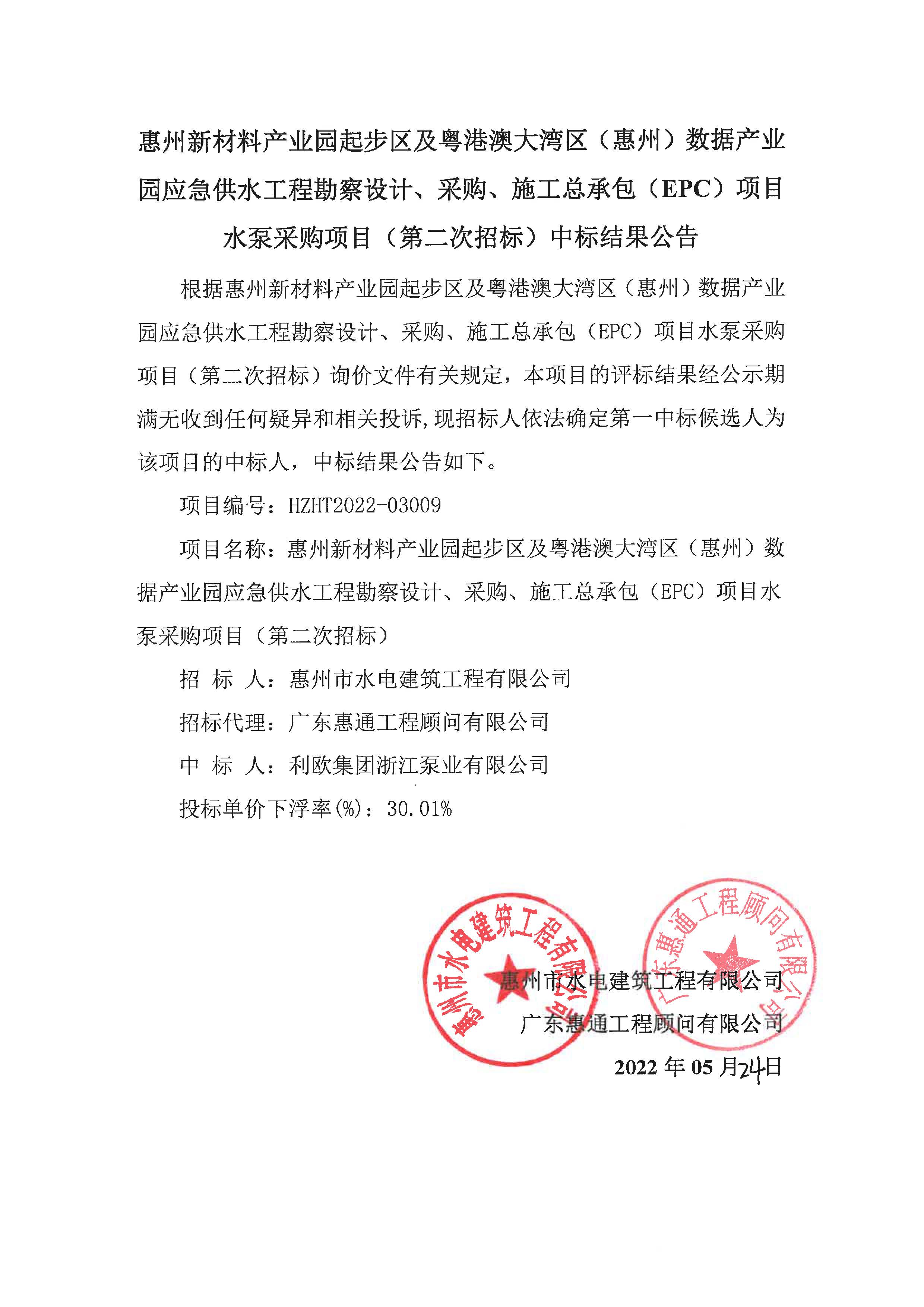 惠州新材料產(chǎn)業(yè)園起步區(qū)及粵港澳大灣區(qū)(惠州)數(shù)據(jù)產(chǎn)業(yè)園應(yīng)急供水工程勘察設(shè)計(jì)、采購、施工總承包(EPC)項(xiàng)目水泵采購項(xiàng)目(第二次招標(biāo))評(píng)標(biāo)結(jié)果公示