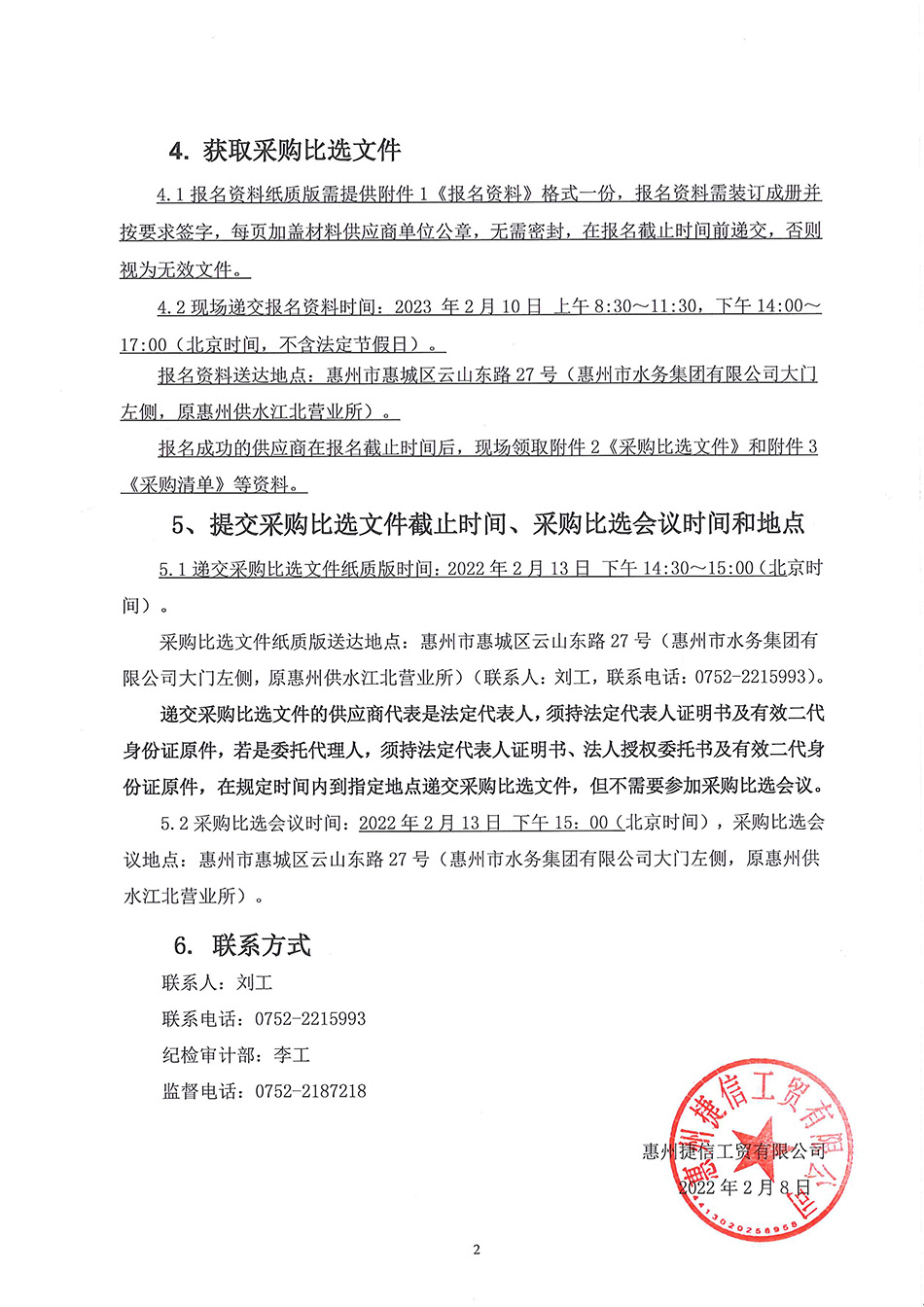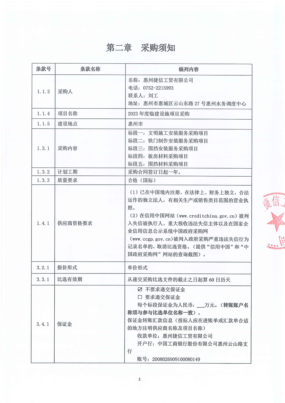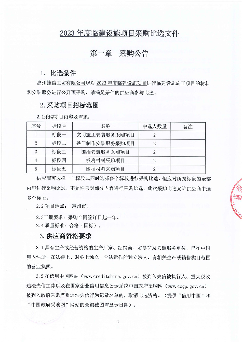 惠州捷信工貿(mào)公司2023年度臨建設(shè)施項目采購公告