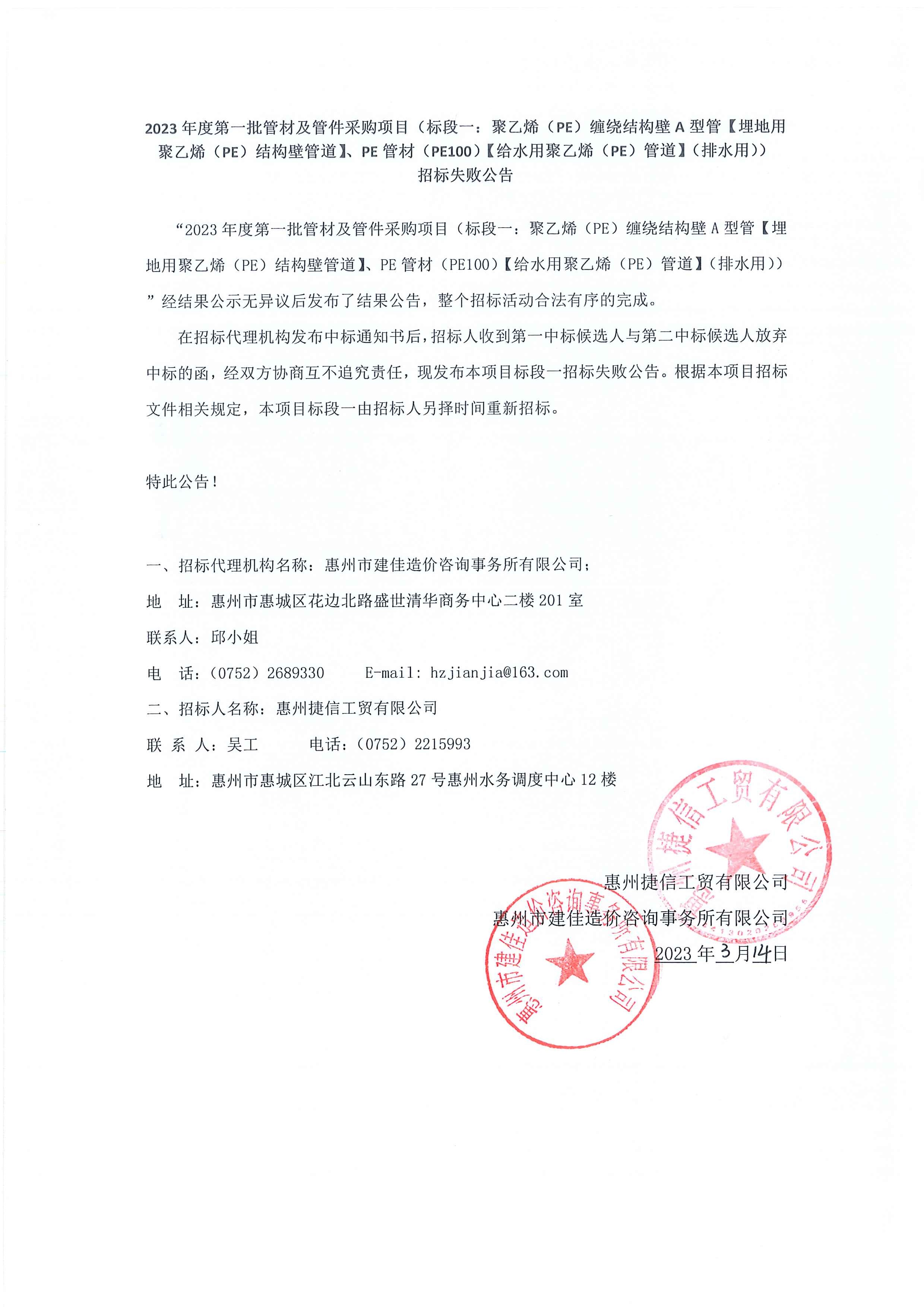捷信工貿(mào)公司2023年度第一批管材及管件采購項目(標(biāo)段一)招標(biāo)失敗公告