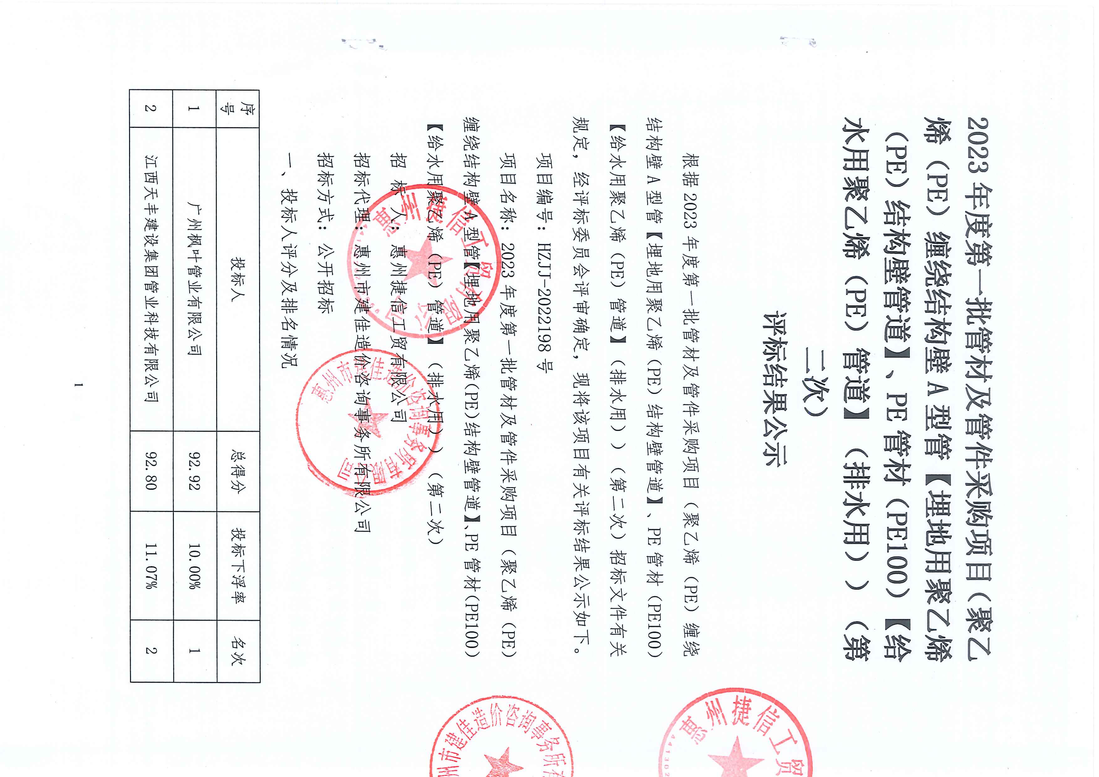 捷信工貿(mào)公司2023年度第一批管材及管件采購(gòu)項(xiàng)目(標(biāo)段一)(第二次)評(píng)標(biāo)結(jié)果公示