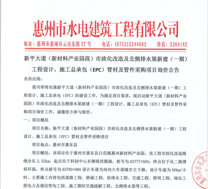 新平大道(新材料產(chǎn)業(yè)園段)市政化改造及北側(cè)排水渠新建(一期)工程設(shè)計(jì)、施工總承包(EPC)管材及管件采購(gòu)項(xiàng)目詢價(jià)公告附件:/upload/202501/09/202501091027224112.xls......