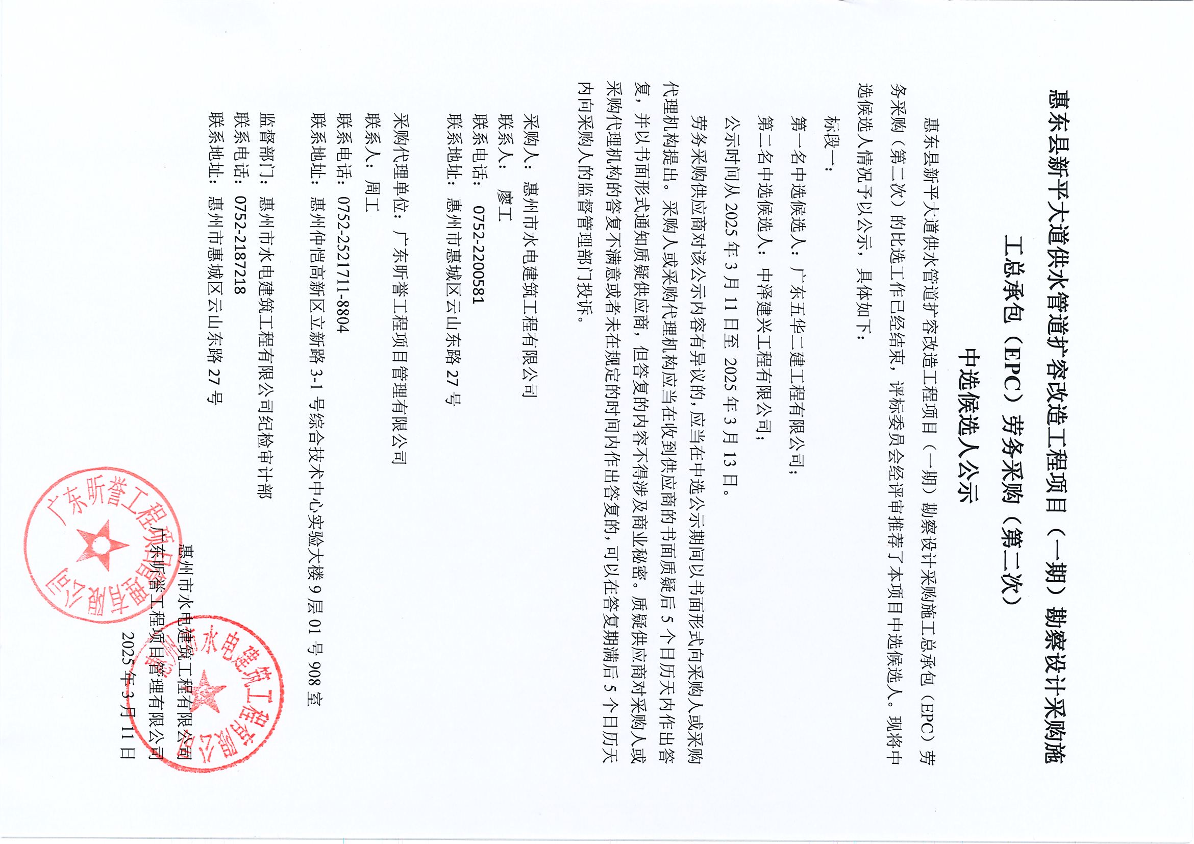 惠東縣新平大道供水管道擴(kuò)容改造工程項(xiàng)目(一期)勘察設(shè)計(jì)采購施工總承包(EPC)勞務(wù)采購(第二次)中選候選人公示