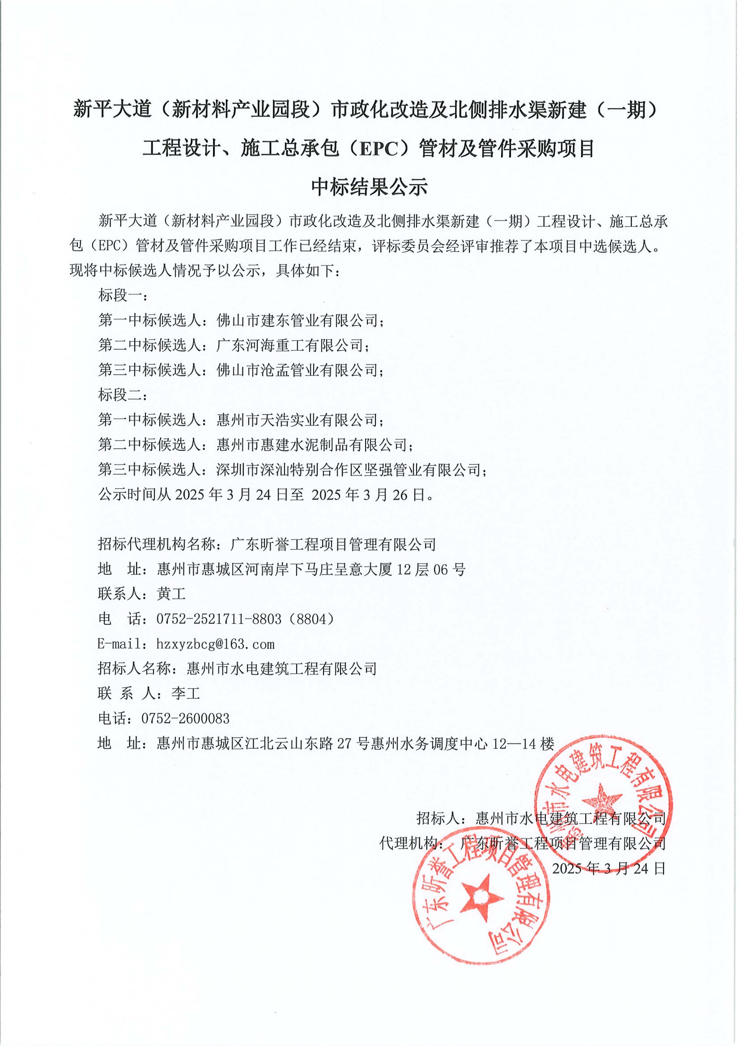 新平大道(新材料產(chǎn)業(yè)園段)市政化改造及北側(cè)排水渠新建(一期)工程設(shè)計(jì)、施工總承包(EPC)管材及管件采購(gòu)項(xiàng)目中標(biāo)結(jié)果公示