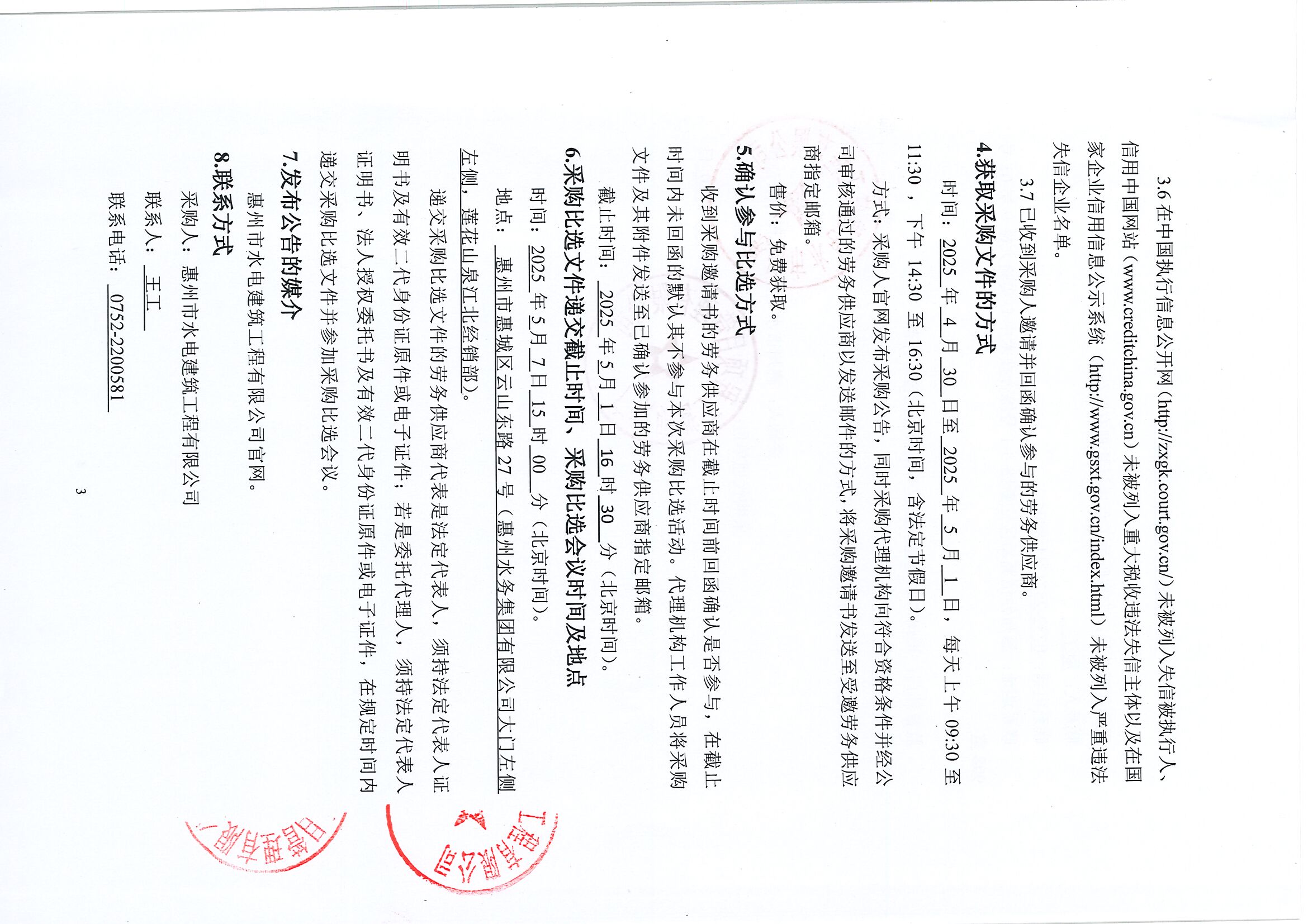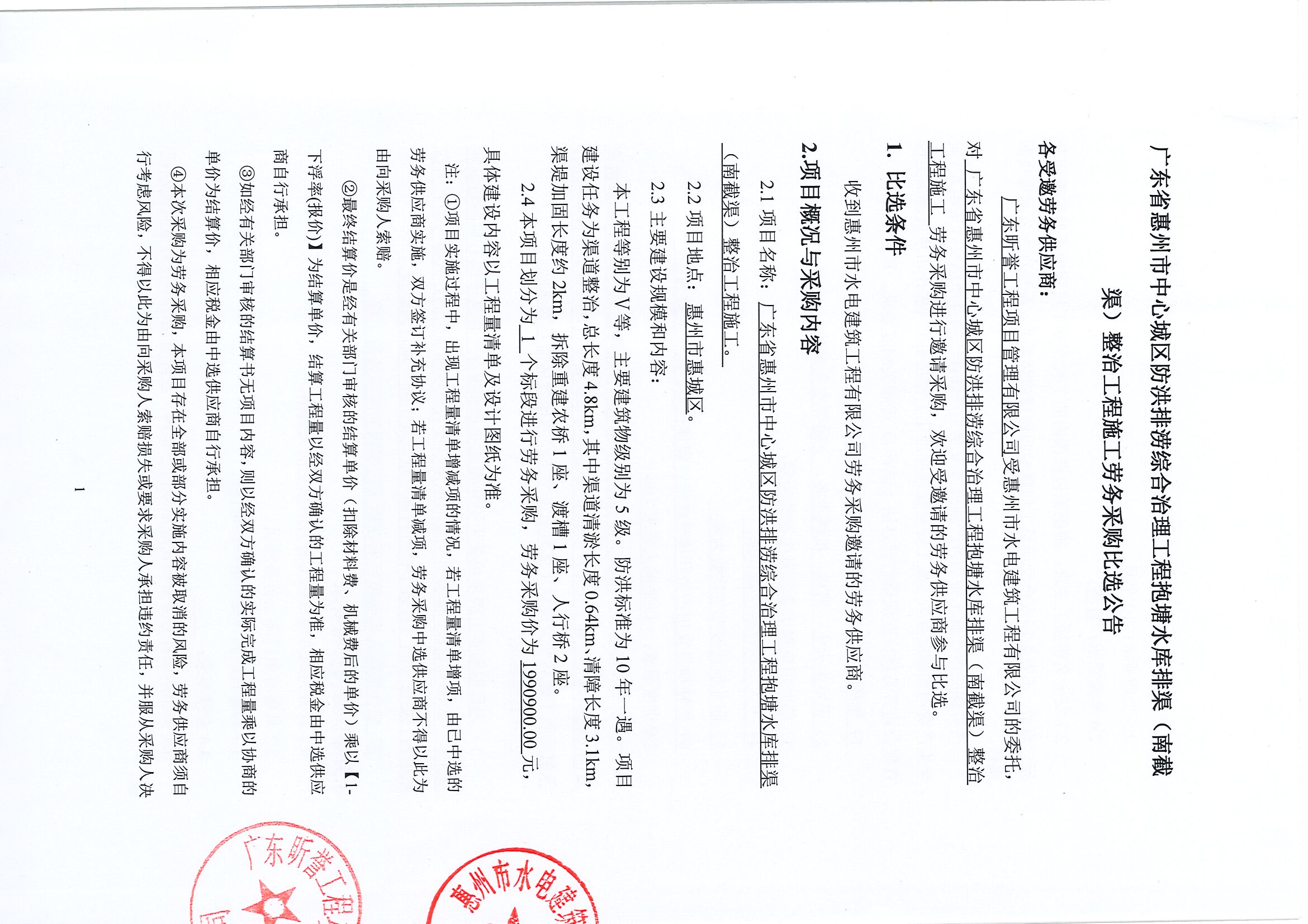 廣東省惠州市中心城區(qū)防洪排澇綜合治理工程抱塘水庫排渠(南截渠)整治工程施工勞務(wù)采購中選候選人公示
