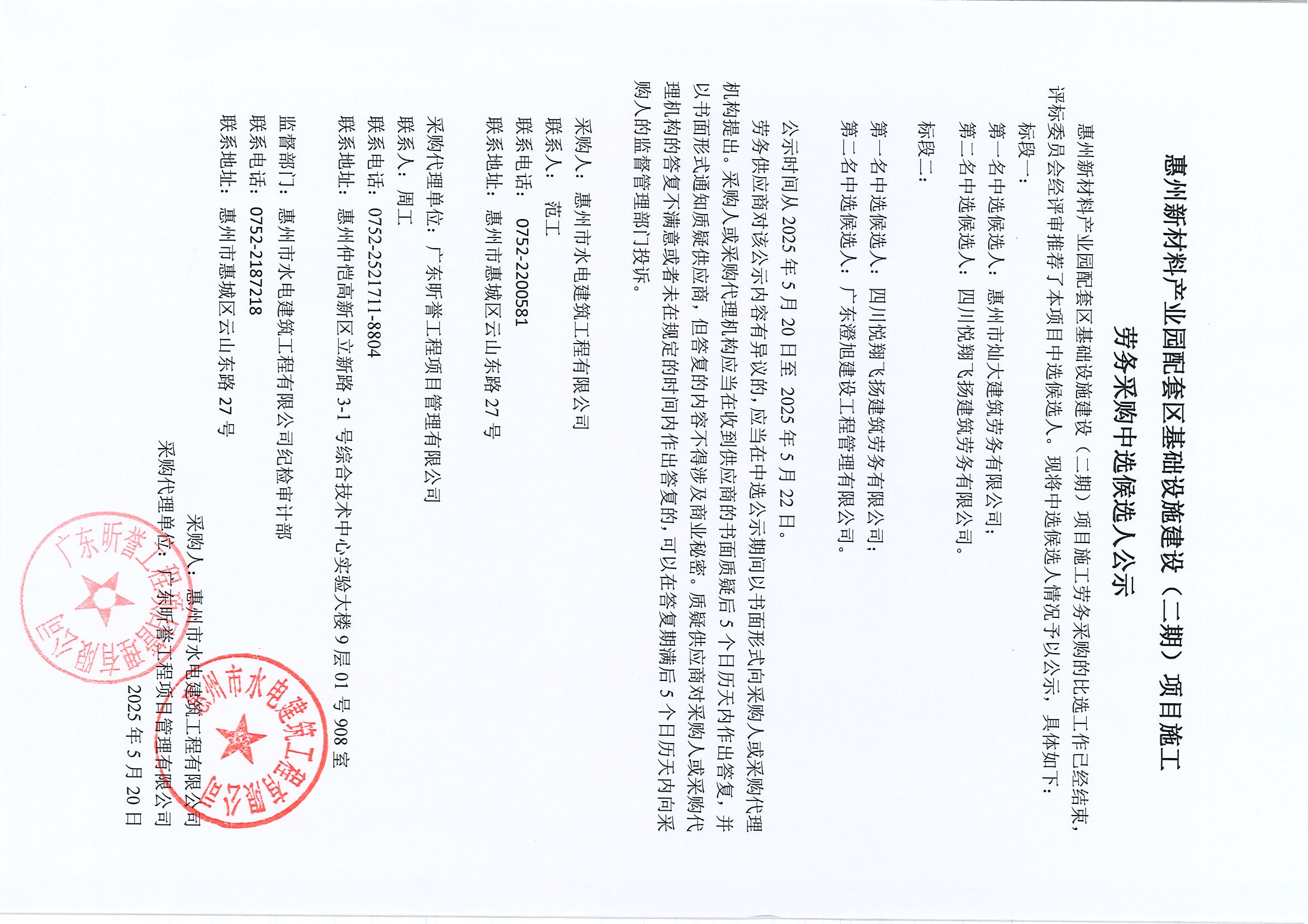 惠州新材料產(chǎn)業(yè)園配套區(qū)基礎(chǔ)設(shè)施建設(shè)(二期)項目施工勞務(wù)采購中選候選人公示