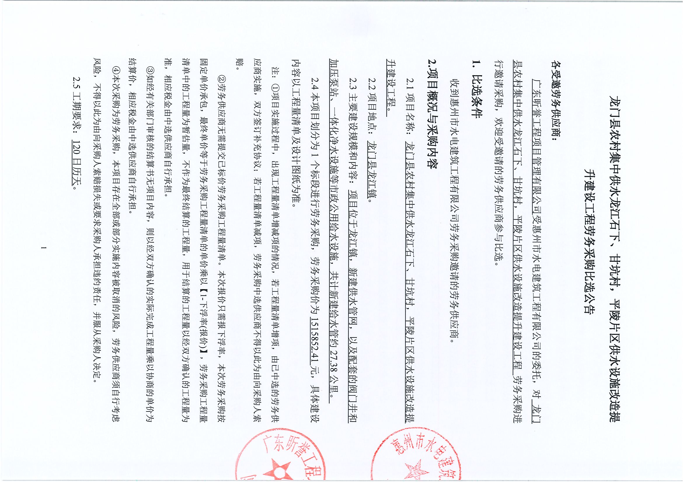 龍門縣農(nóng)村集中供水龍江石下、甘坑村,平陵片區(qū)供水設(shè)施改造提升建設(shè)工程勞務(wù)采購比選公告