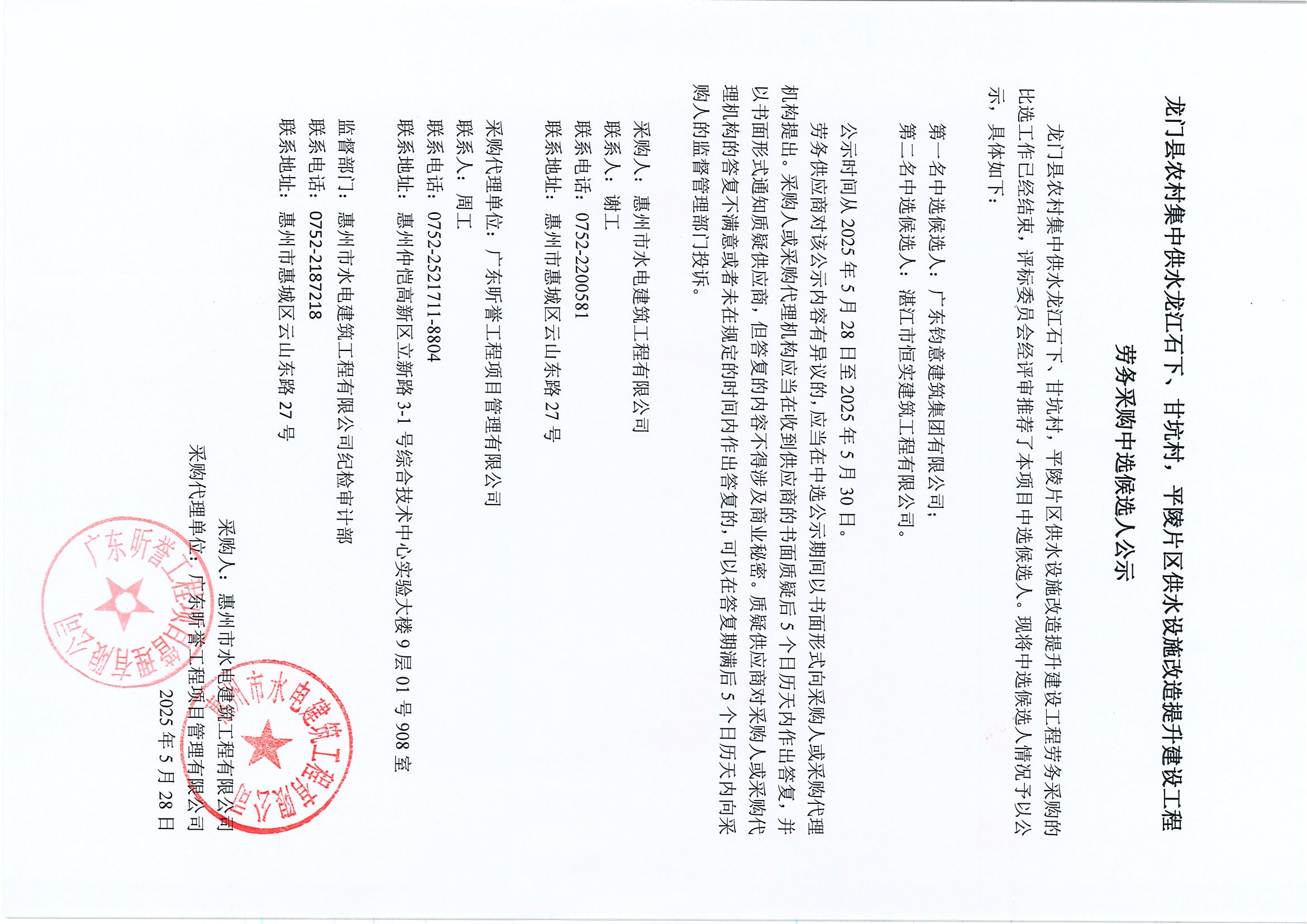龍門縣農(nóng)村集中供水縣城擴(kuò)網(wǎng)至龍華片區(qū)大坪、石下塘、花竹村供水管網(wǎng)建設(shè)工程勞務(wù)采購中選候選人公示