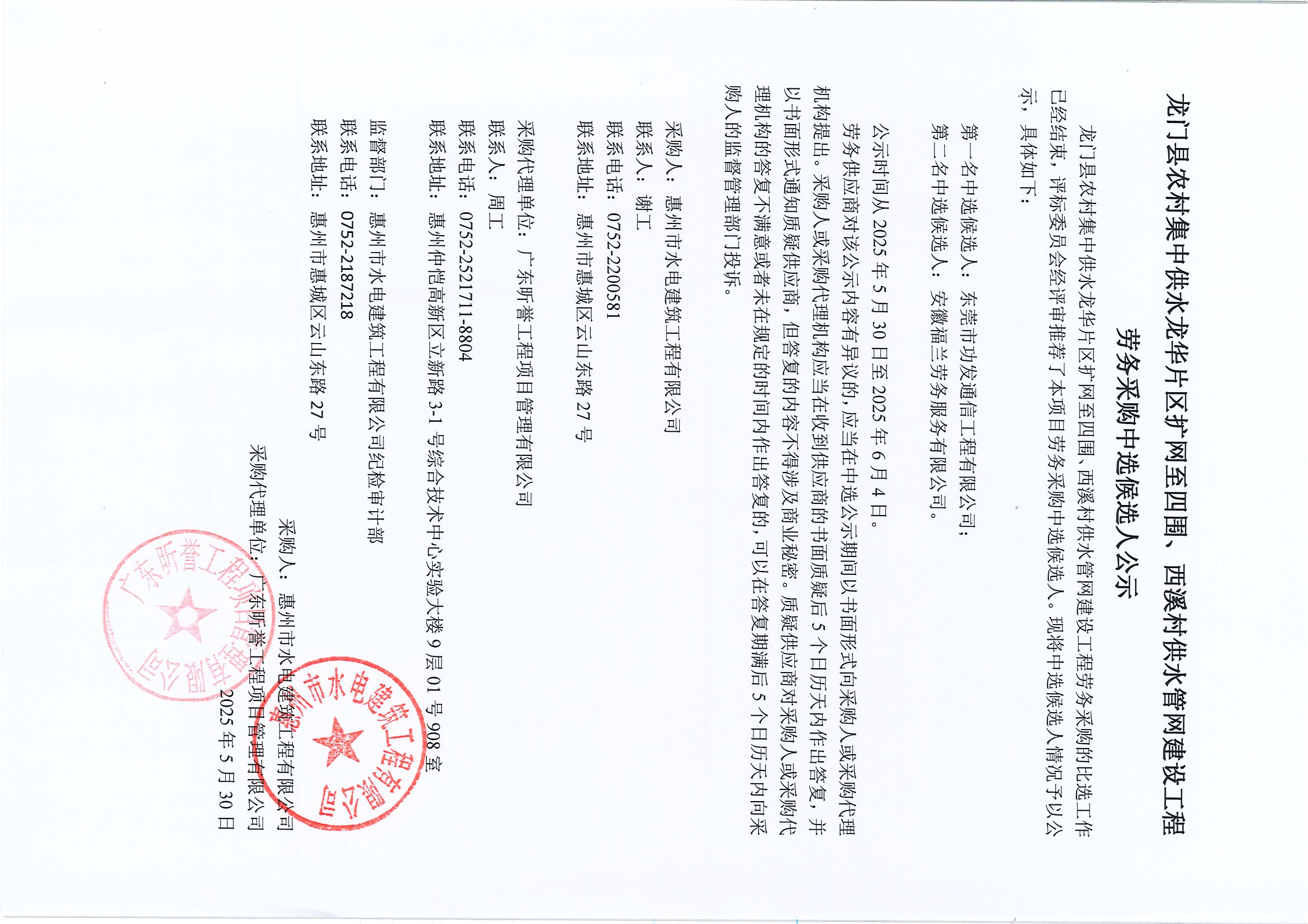 龍門縣農(nóng)村集中供水龍華片區(qū)擴網(wǎng)至四圍、西溪村供水管網(wǎng)建設(shè)工程勞務(wù)采購中選候選人公示