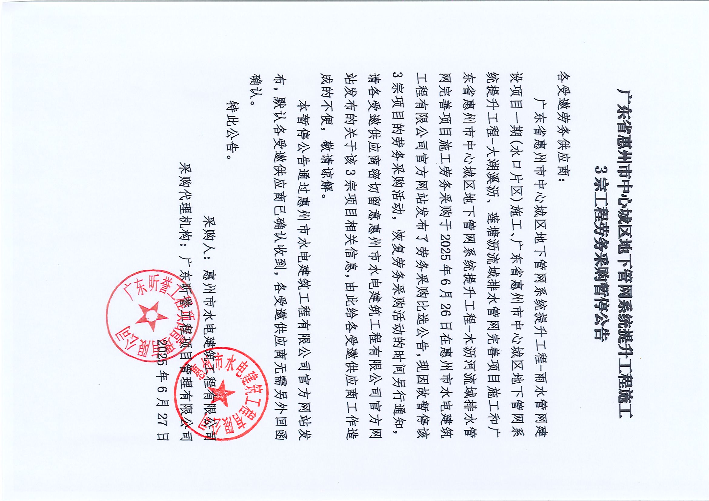 廣東省惠州市中心城區(qū)地下管網(wǎng)系統(tǒng)提升工程施工 3宗工程勞務(wù)采購暫停公告