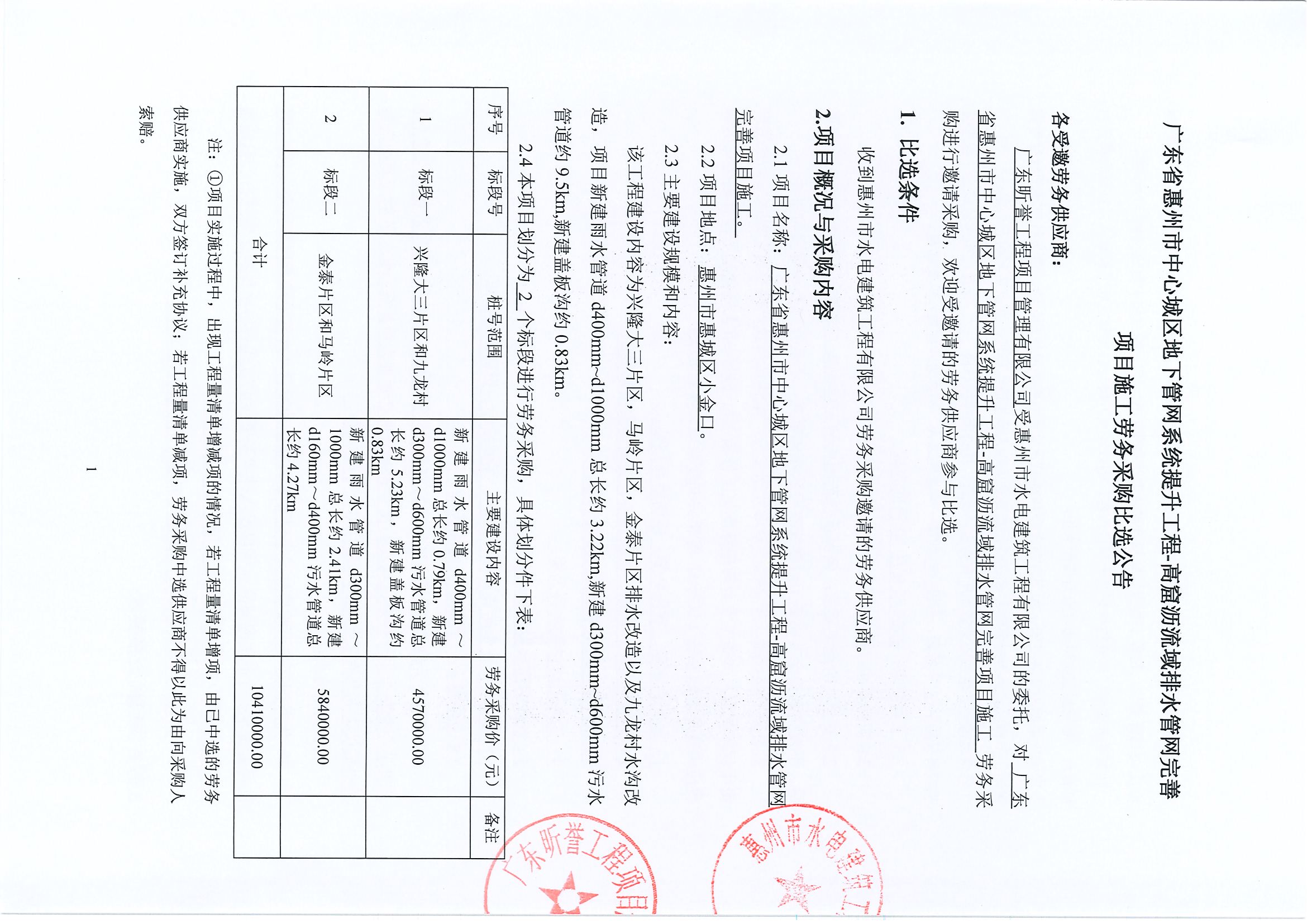 廣東省惠州市中心城區(qū)地下管網(wǎng)系統(tǒng)提升工程-高窟瀝流域排水管網(wǎng)完善項目施工勞務(wù)采購比選公告