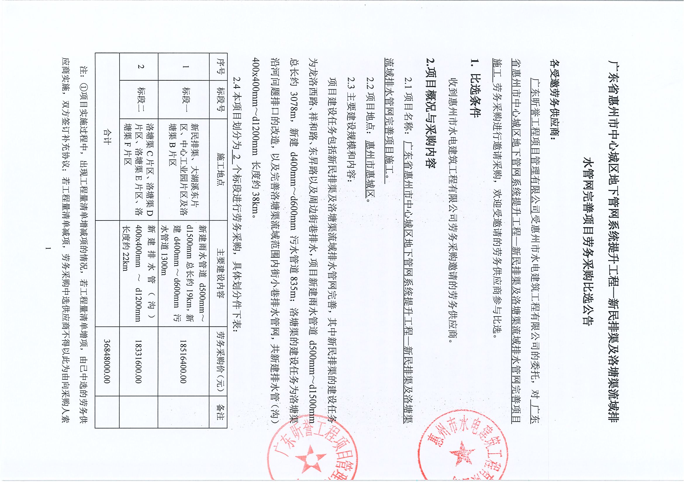 廣東省惠州市中心城區(qū)地下管網(wǎng)系統(tǒng)提升工程—新民排渠及洛塘渠流域排水管網(wǎng)完善項(xiàng)目勞務(wù)采購(gòu)比選公告