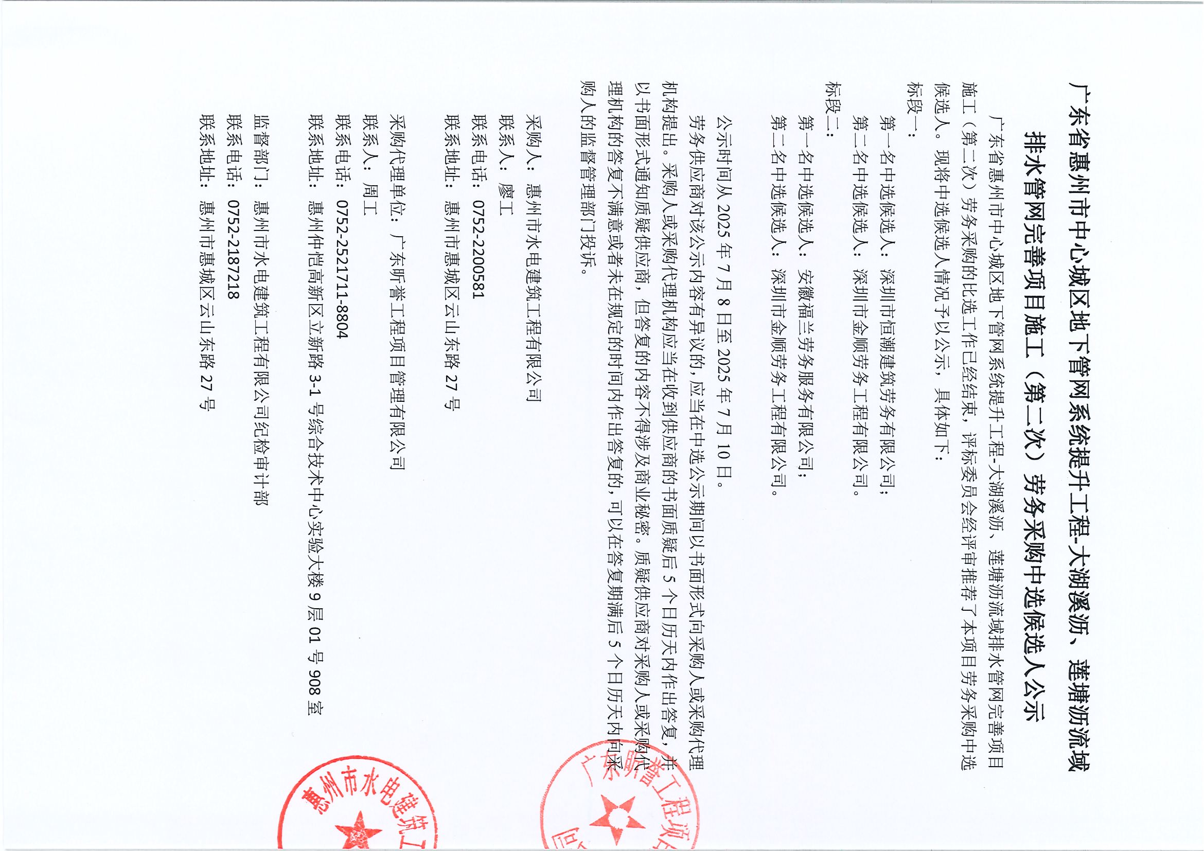 廣東省惠州市中心城區(qū)地下管網(wǎng)系統(tǒng)提升工程-木瀝河流域排水管網(wǎng)完善項(xiàng)目施工(第二次)勞務(wù)采購中選候選人公示