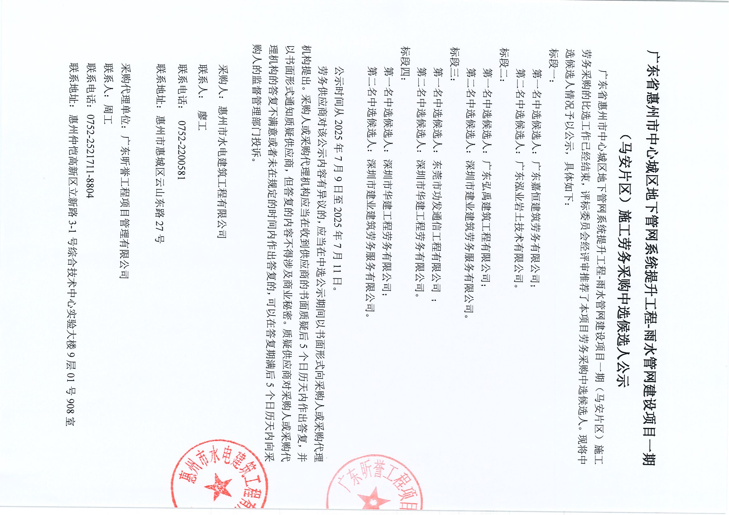 廣東省惠州市中心城區(qū)地下管網(wǎng)系統(tǒng)提升工程-高窟瀝流域排水管網(wǎng)完善項目施工勞務采購中選候選人公示