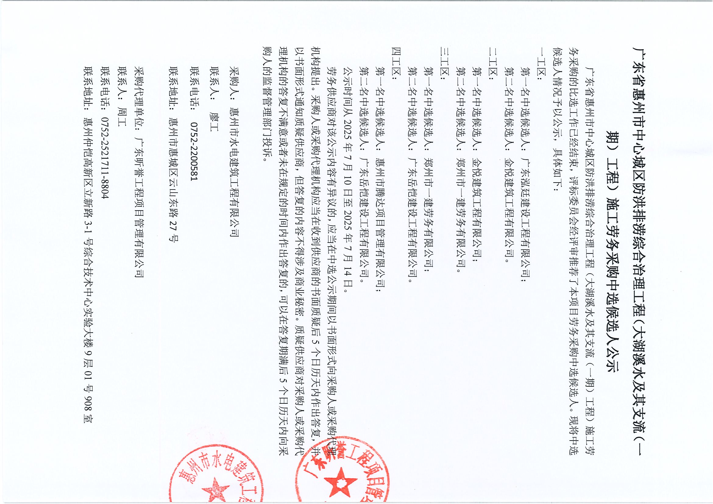 廣東省惠州市中心城區(qū)防洪排澇綜合治理工程(青邊瀝治理(一期)工程)施工勞務采購中選候選人公示
