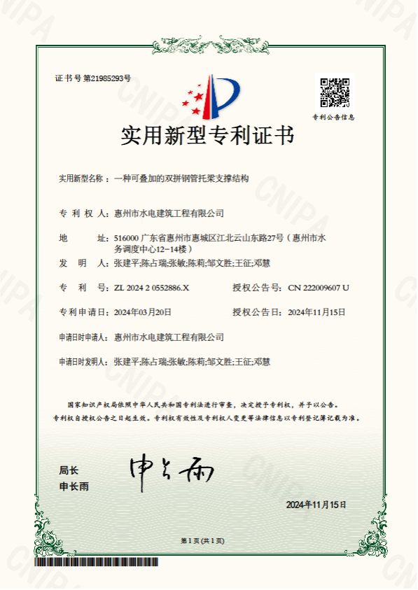 近日,由我司自主研發(fā)的“一種可疊加的雙拼鋼管托梁支撐結(jié)構(gòu)”獲國(guó)家知識(shí)產(chǎn)權(quán)局授予實(shí)用新型專利證書,標(biāo)志著公司在創(chuàng)新發(fā)展的道路上又向前邁進(jìn)堅(jiān)實(shí)一步。